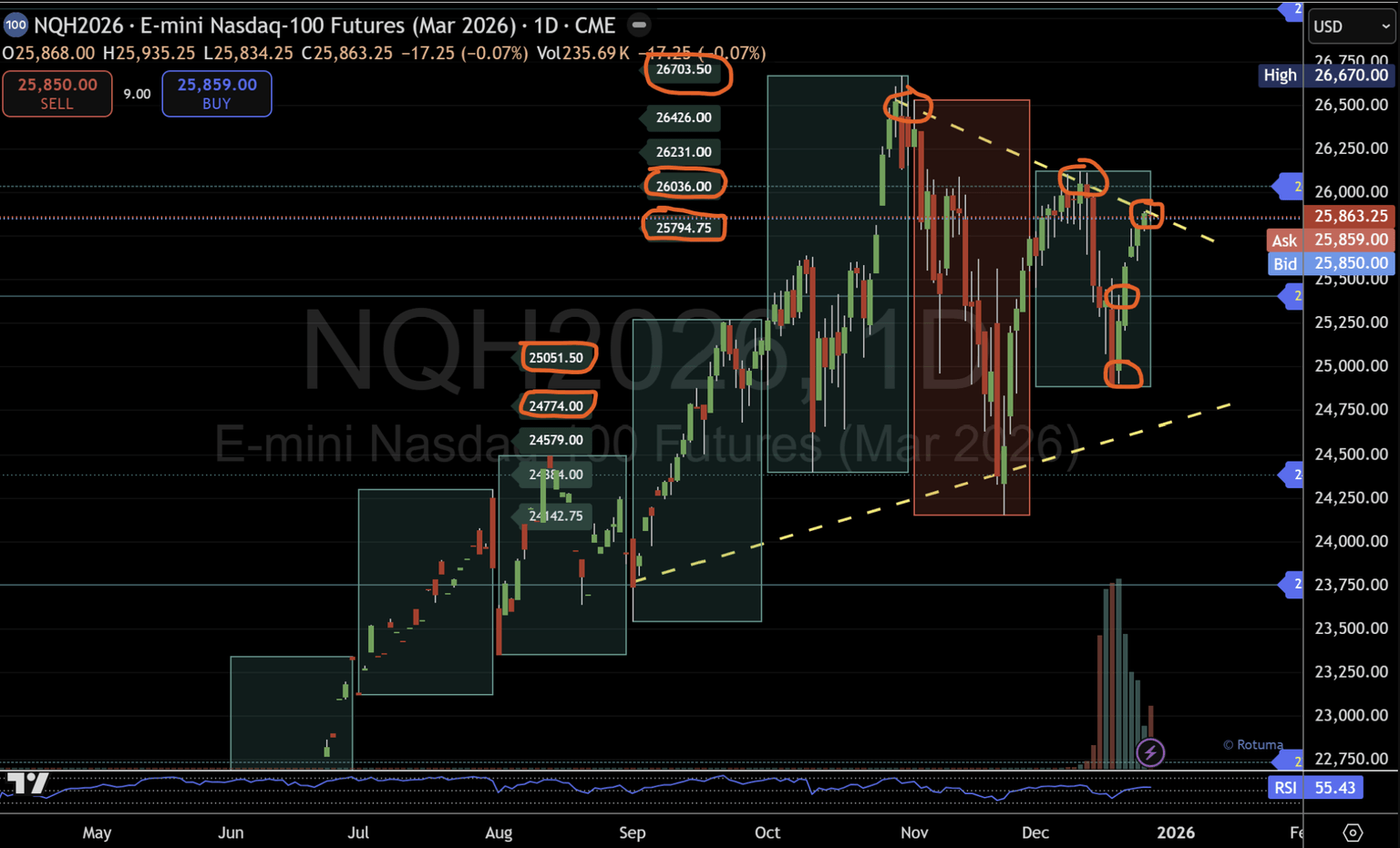 Desde la última actualización el 27 de diciembre, los futuros de Nasdaq de marzo han luchado por mantener la aceptación por encima del nivel micro 1 en 25.794, a pesar de haber negociado brevemente más alto tras la recuperación anterior del pivote central de 25.405 el 19 de diciembre.