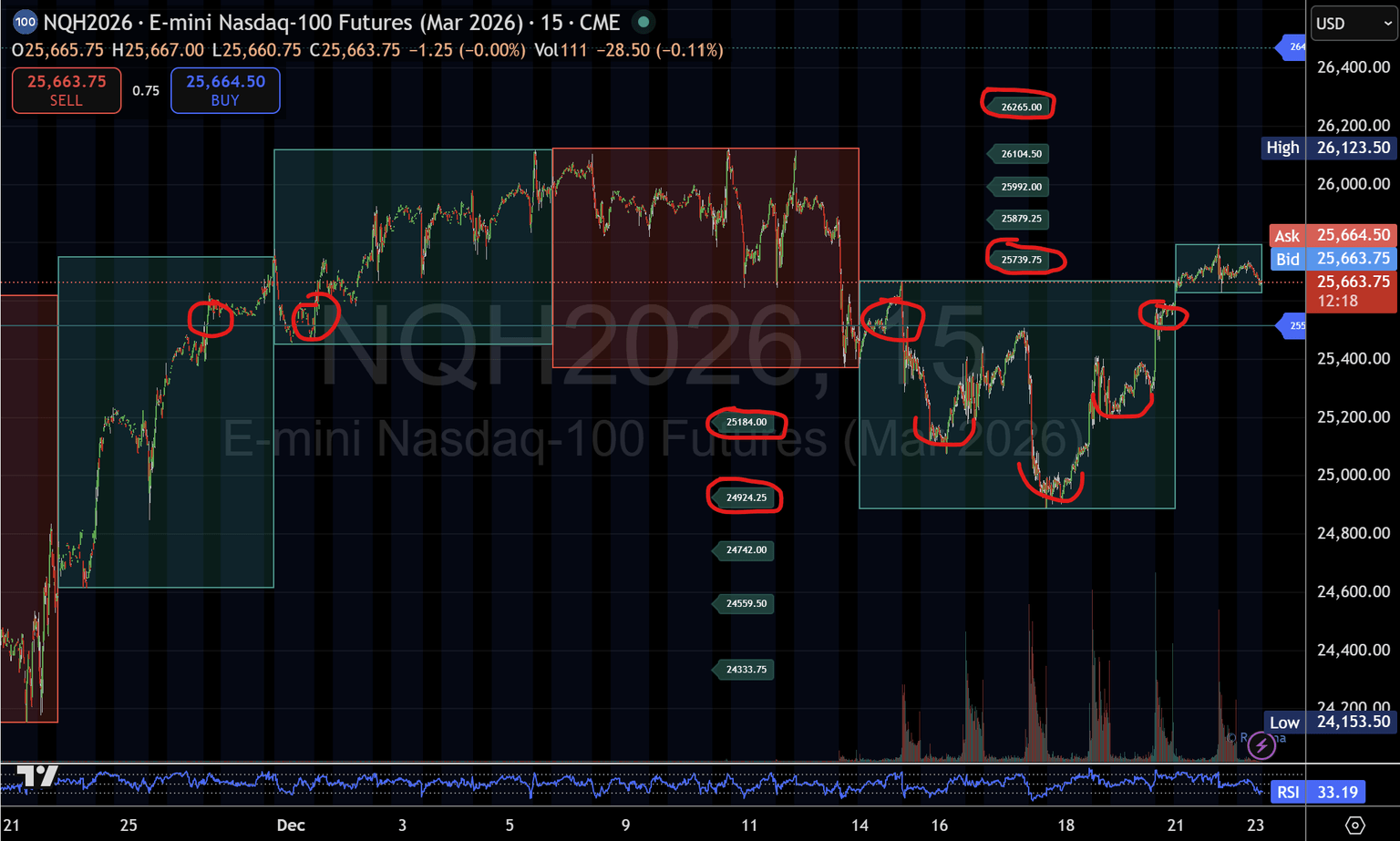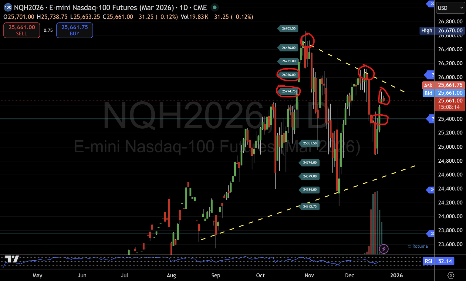 El viernes, los futuros del Nasdaq cerraron por encima del pivote central de 25,405, confirmando la aceptación de nuevo en la mitad superior de la estructura diaria y validando el marco de rotación establecido en la actualización de escritorio anterior.