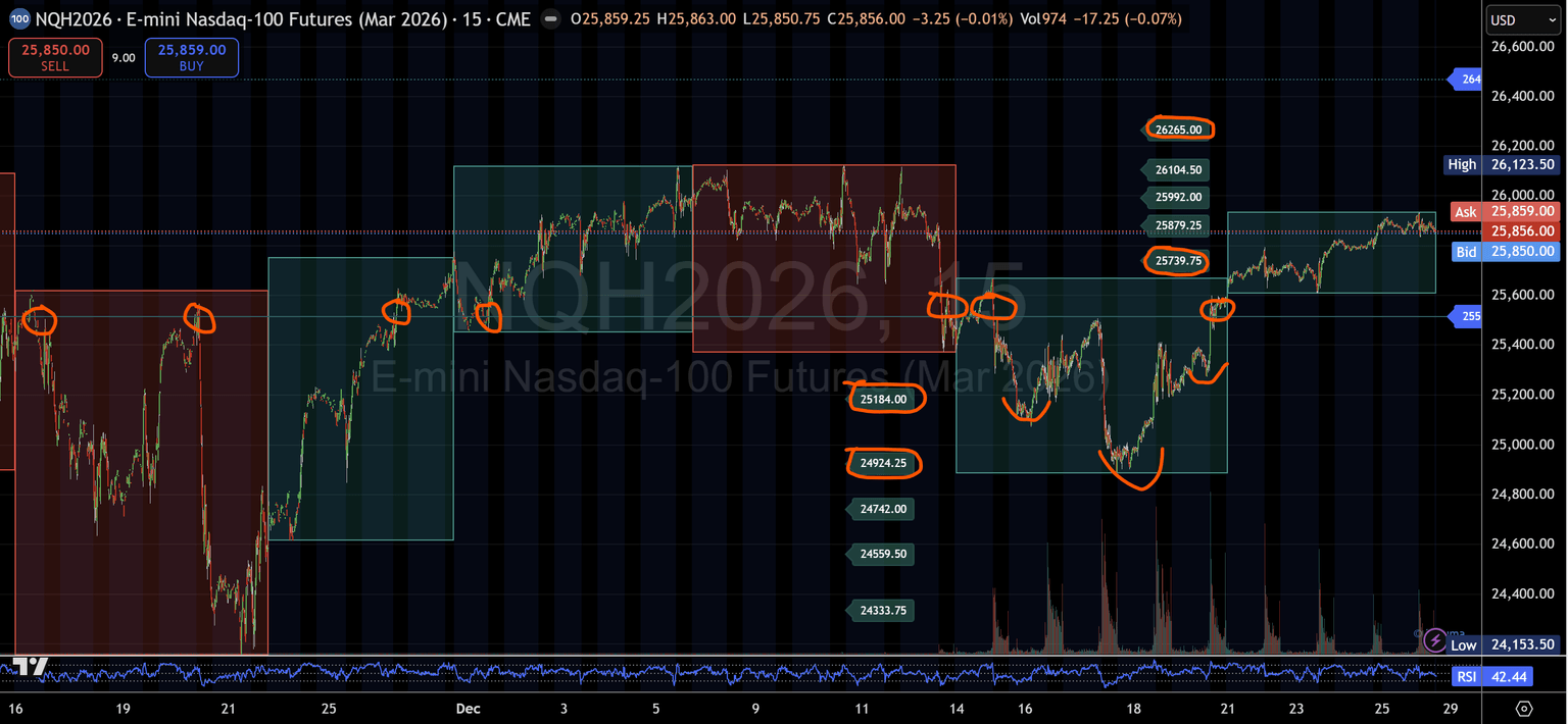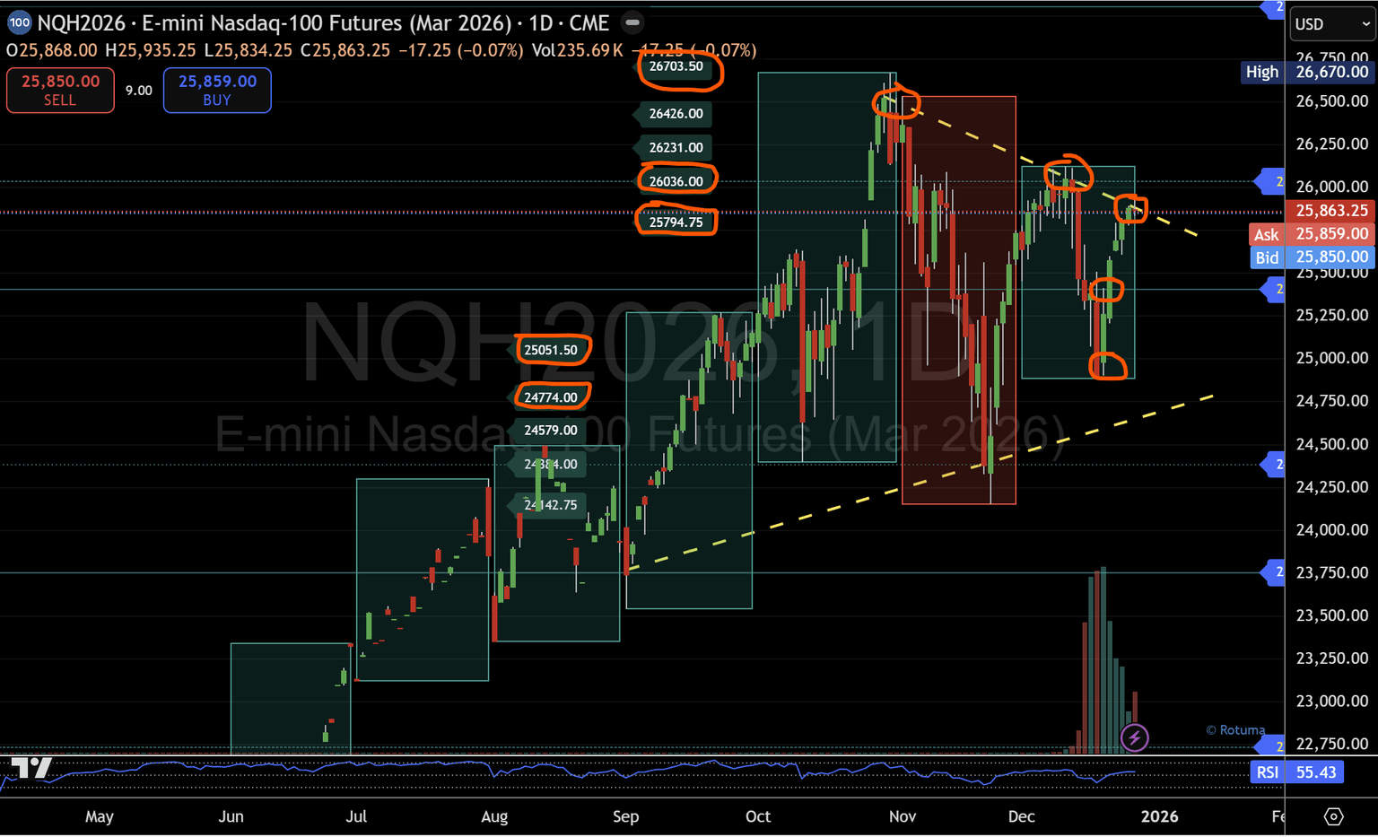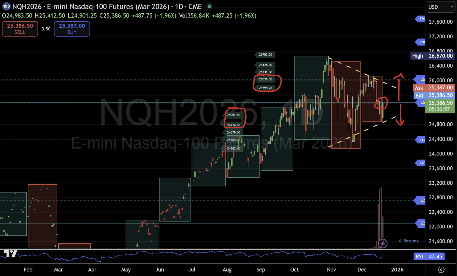 Los futuros de Nasdaq de marzo cerraron la semana de Navidad por encima de micro 1 en 25,794, marcando un desarrollo clave en el marco temporal diario tras la recuperación del pivote central de 25,405 el 19 de diciembre, como se describió en la actualización anterior del escritorio.