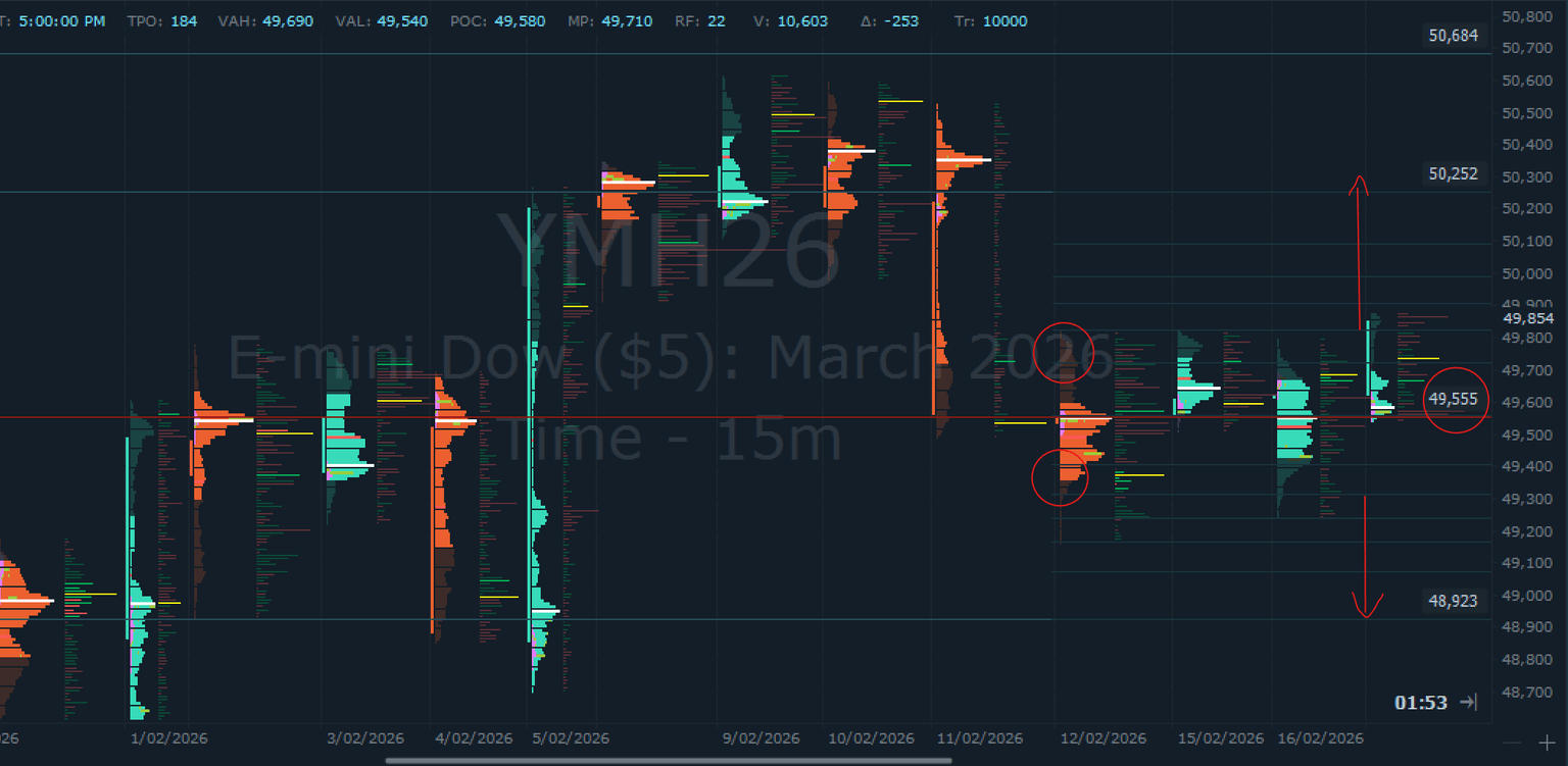 YM reflejó a ES tras la rotación completa del martes: el precio marcó 49.239, luego rotó de nuevo al alza y recuperó CP 49.555, regresando por encima del área de mayor volumen. El mapa de febrero sigue siendo una estructura de dos vías, con el enfoque de hoy en si la puerta superior puede convertir la resistencia en aceptación.