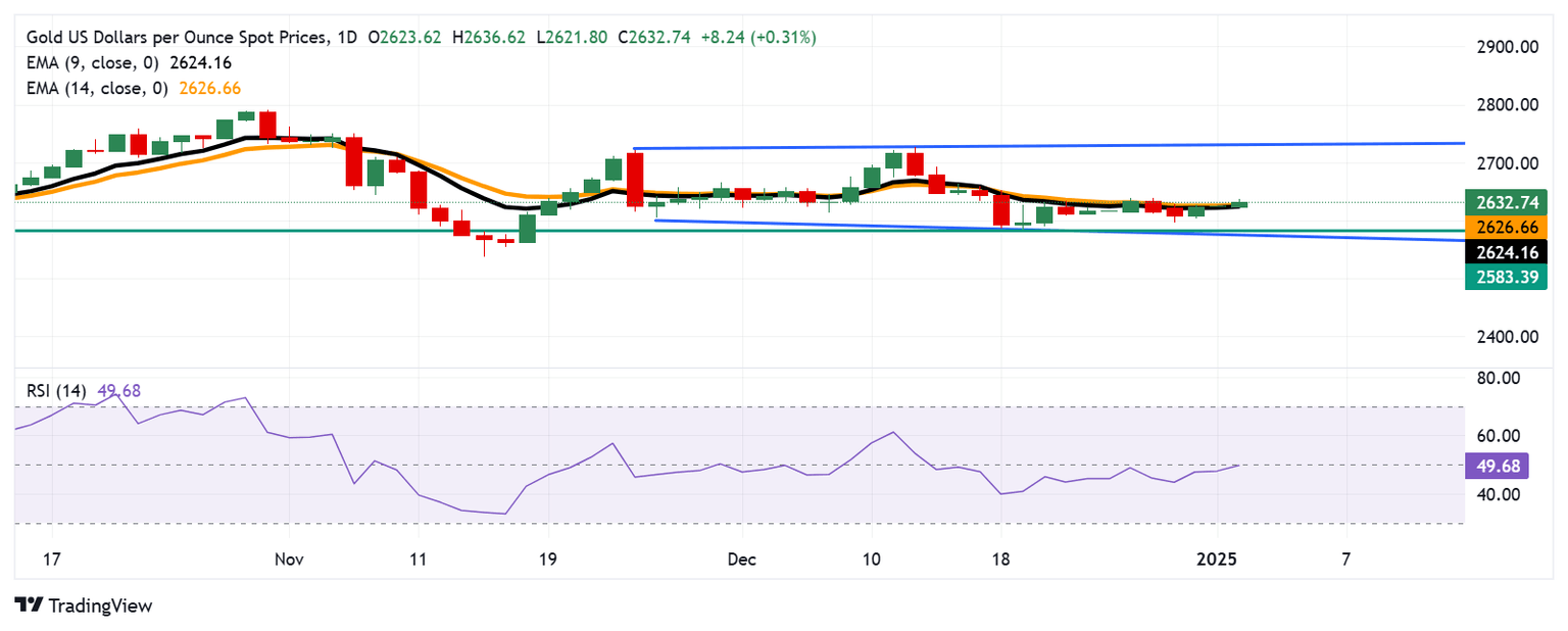 El precio del Oro cotiza cerca de 2.630,00 $ por onza troy el jueves, con el gráfico diario indicando una fase de consolidación mientras el metal se mueve lateralmente. Sin embargo, el precio del metal amarillo se mueve por encima de las medias móviles exponenciales (EMAs) de 9 y 14 días, lo que sugiere un cambio alcista en el impulso a corto plazo. Además, el Índice de Fuerza Relativa (RSI) de 14 días se mantiene alrededor de la marca de 50, reflejando un sentimiento neutral.
