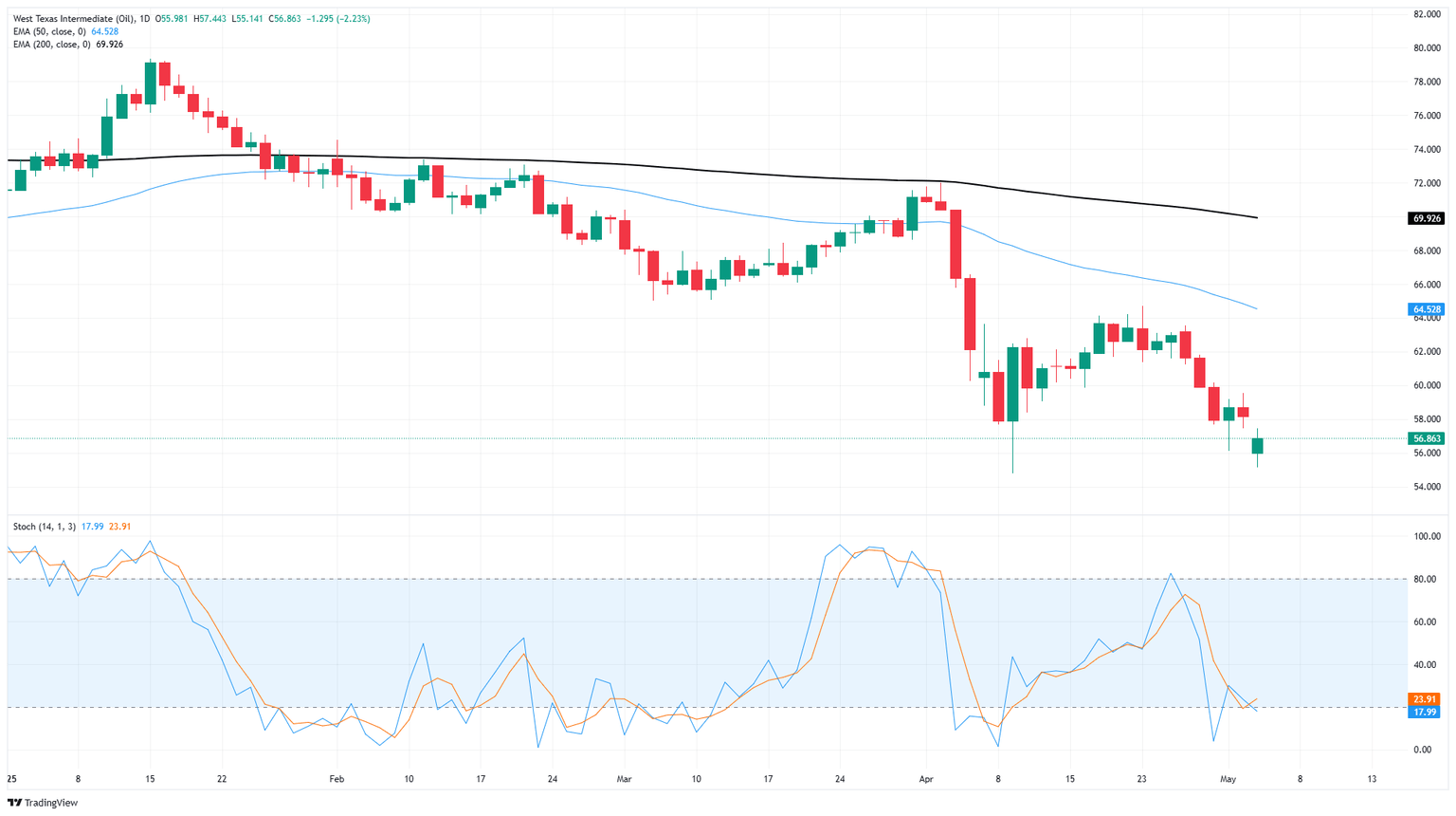 Las ofertas de barriles de WTI cayeron brevemente por debajo de 56.00$ el lunes, bajando a un mínimo a corto plazo de 55.14$ antes de recuperar terreno durante la sesión intradía hacia la región de 57$. Los precios del petróleo crudo de EE.UU. siguen cayendo drásticamente desde los picos de mediados de abril cerca de 64.00$ por barril. Sin embargo, parece que se ha fijado un suelo técnico en el nivel de 56.00$.
