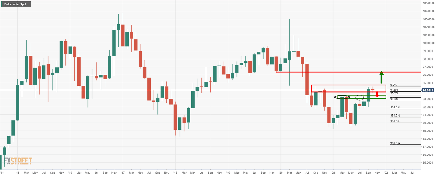 El dólar está subiendo modestamente desde los mínimos diarios en el lanzamiento. Antes de las Minutas, el dólar estadounidense había retrocedido desde un máximo anual debido a que los rendimientos de los bonos del Tesoro a más largo plazo cayeron después de los datos de inflación de EE.UU., a pesar de que mostraban que los precios subieron sólidamente en septiembre, lo que adelantó las expectativas de ajuste de la Reserva Federal. Sin embargo, el dólar ha estado listo para las elecciones bajistas considerando lo lejos que ha llegado en solo un par de semanas, subiendo un 1.7% y chocando con un muro de resistencia según los máximos de septiembre de 2020.