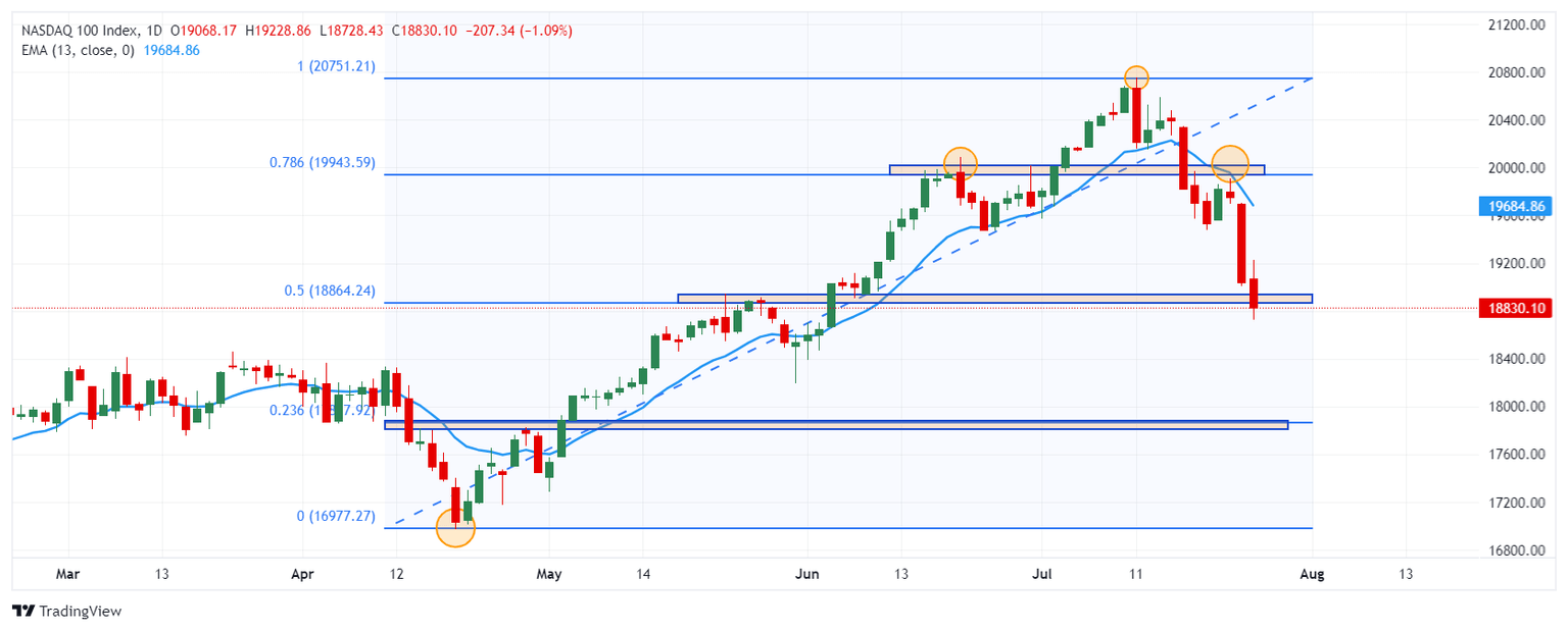 El índice tecnológico registra su tercera sesión consecutiva a la baja, acumulando una pérdida semanal de un 4.35%, regresando a niveles del 5 de junio.