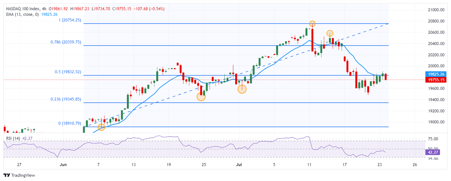 El Nasdaq 100 formó una resistencia en el corto plazo en 19.830, en confluencia con el Promedio Móvil Exponencial de 13 periodos y el retroceso al 50% de Fibonacci. El primer soporte se encuentra en 19.468, mínimo del 25 de junio. El siguiente soporte clave se ubica en 18.903, mínimo del 7 de junio.
