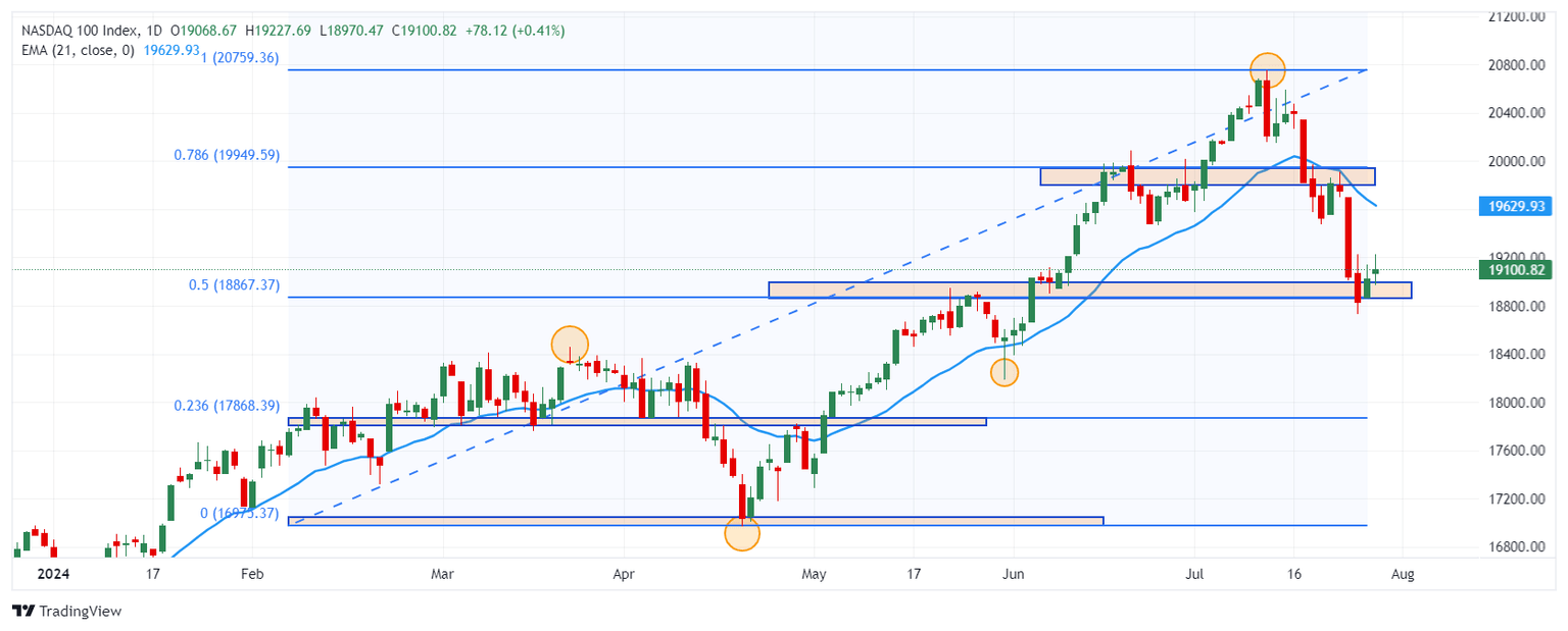 El Nasdaq 100 formó un soporte en el corto plazo en el mínimo del 25 de julio ubicado en 18.728. El siguiente soporte se encuentra en 18.000, en convergencia con el retroceso al 23.6% de Fibonacci. La resistencia más cercana la observamos en 19.629, dado por el Promedio Móvil Exponencial de 21 periodos.