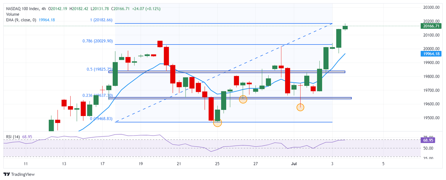 - El índice Nasdaq 100 registra su tercera sesión consecutiva al alza y marca un nuevo máximo histórico en 20.182.
