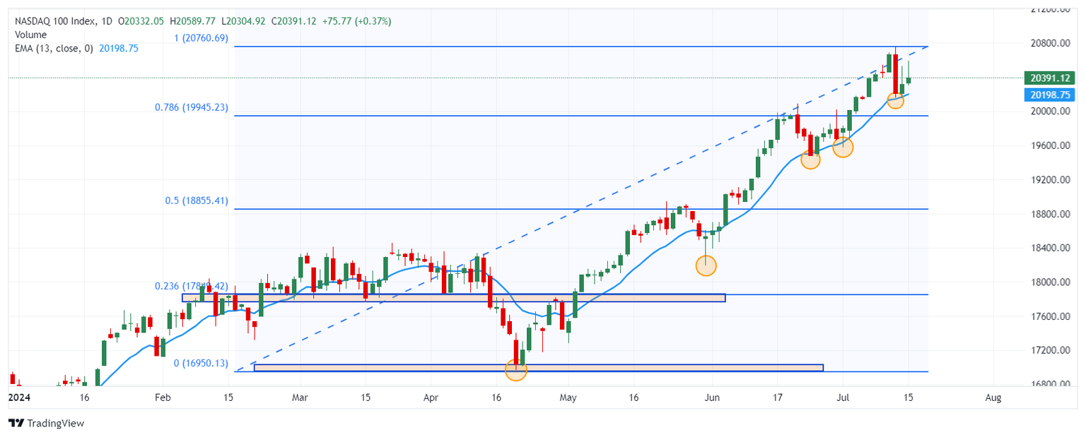 El Nasdaq 100 se encuentra en una clara tendencia alcista, apoyándose en el primer soporte ubicado en la Media Móvil de 13 periodos ubicada en 20.198. El siguiente soporte se encuentra en 19.945, dado por el retroceso al 78.6% de Fibonacci. La resistencia más cercana está en 20.754, máximo histórico establecido el 11 de julio.
