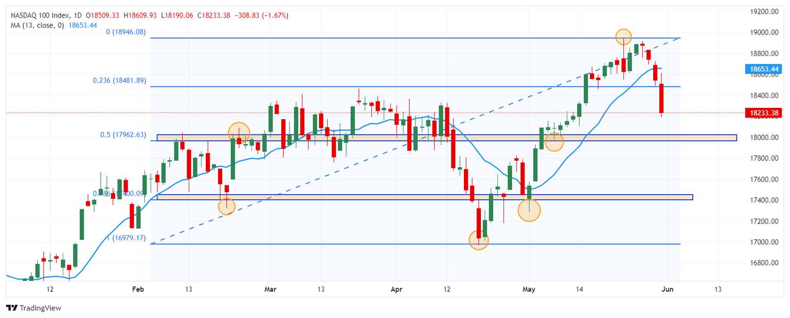 El Nasdaq 100 inició la sesión europea alcanzando un máximo del día en 18.609, sin embargo, encontró vendedores que llevaron el índice a terreno negativo marcando un mínimo del día en 18.190 durante la sesión americana. Actualmente, el Nasdaq 100 opera en 18.226, perdiendo un 1.75% en el día.