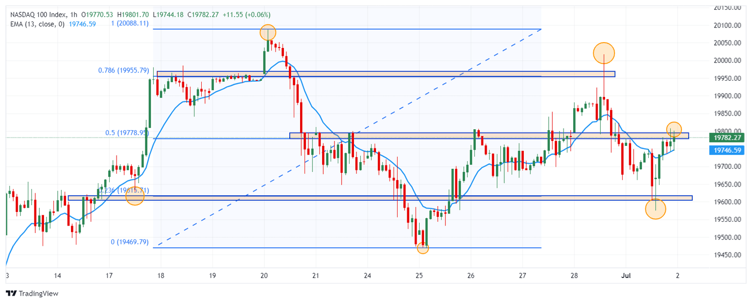 El Nasdaq 100 se encuentra en una consolidación entre 20.100 y 19.470. El índice ha establecido un primer soporte en 19.600, en confluencia con el retroceso al 23.6% de Fibonacci. La resistencia más cercana se encuentra en 20.017, máximo alcanzado el 28 de junio. Destacamos la Media Móvil Exponencial de 13 periodos, ya que ha funcionado como soporte en el corto plazo.