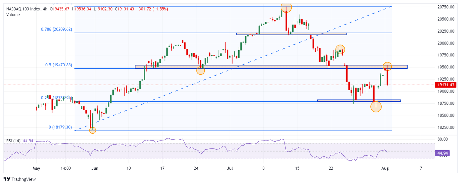 El Nasdaq 100 estableció un máximo de la sesión en 19.536, encontrando vendedores agresivos que llevaron el índice a un mínimo del día en 19.102. Al momento de escribir, el Nasdaq 100 opera en 19 113, perdiendo un 1.19%, el día de hoy.