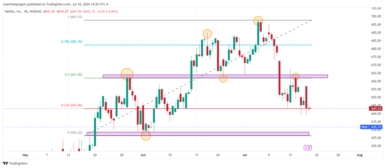 La acción de Netflix inició la sesión americana marcando un máximo en 656.59 $, encontrando vendedores que llevaron la acción a un mínimo diario en 639.26 $. Al concluir la jornada, Netflix cerró en 643.04 $, perdiendo un 0.68%.