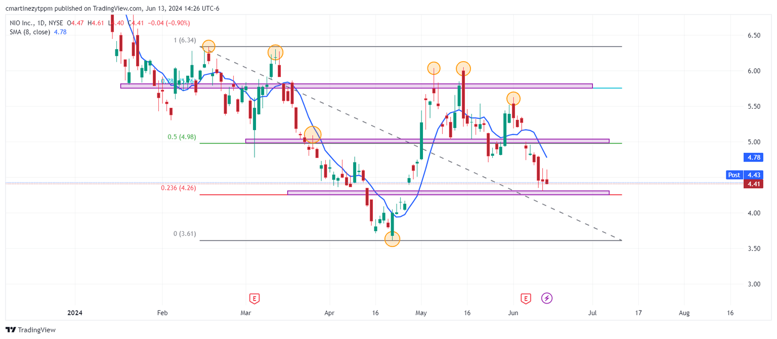 Nio ha estado en una clara tendencia bajista, cuya primera resistencia la observamos en la zona de 6.00 $ – 5.80 $, en confluencia con el 78.6% de retroceso de Fibonacci. El primer soporte está en 4.25 $, dado por el retroceso al 23.6% de Fibonacci. El soporte clave en el mediano plazo se encuentra en 3.61 $, mínimo del 22 de Abril