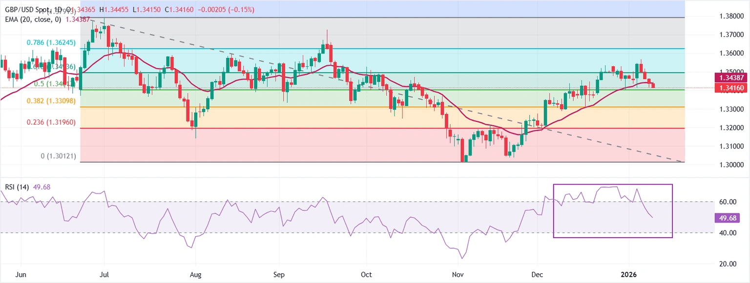 El GBP/USD se mantiene moderado por cuarto día consecutivo, cotizando alrededor de 1.3430 durante las horas asiáticas del viernes. El indicador de impulso Índice de Fuerza Relativa (RSI) de 14 días en 51.9 es neutral, reflejando un impulso más lento después de lecturas recientes firmes. Un retroceso del RSI por debajo de 50 fortalecería el caso para un retroceso más profundo. Leer más...