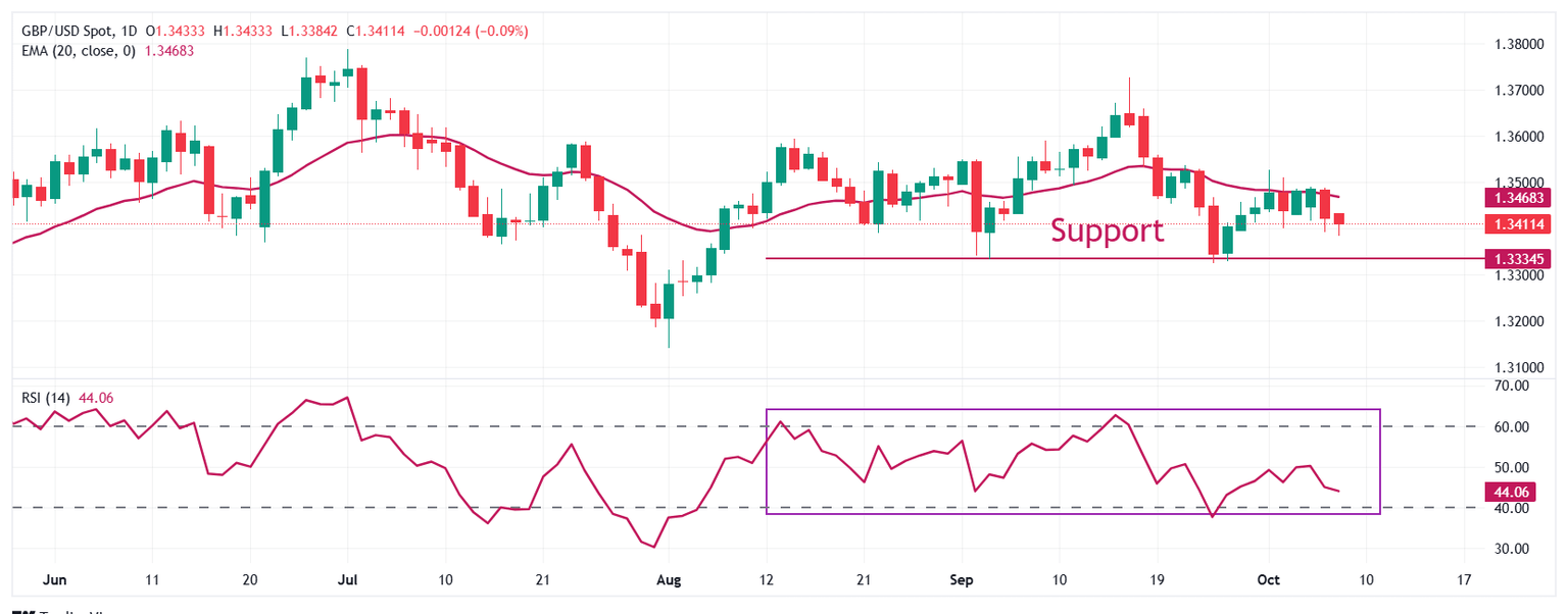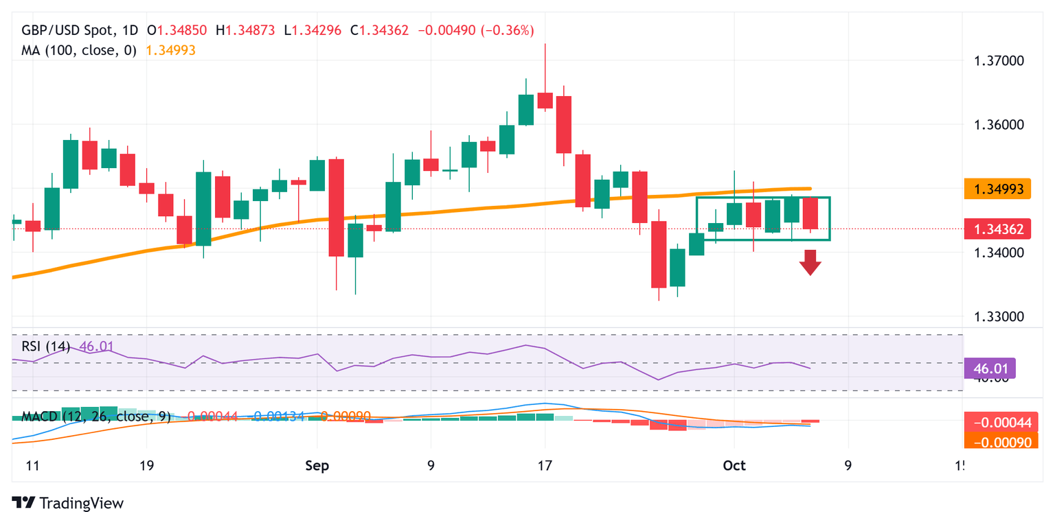 La Libra esterlina (GBP) parece frágil cerca de 1.3400 frente al Dólar estadounidense (USD) durante la sesión de negociación europea del miércoles. El par GBP/USD enfrenta presión de venta a medida que el Dólar estadounidense (USD) supera a sus principales pares de divisas a pesar de que el gobierno de los Estados Unidos (EE.UU.) entra en su segunda semana de cierre.