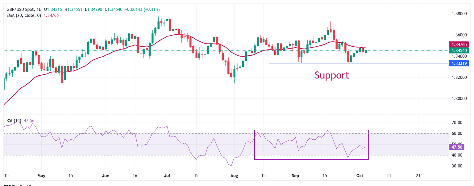 Después de perder alrededor del 0.3% y romper una racha ganadora de cuatro días el jueves, el GBP/USD se mantiene estable alrededor de 1.3450 en la sesión europea del viernes. La perspectiva técnica del par apunta a una pérdida de impulso alcista a medida que la atención del mercado se desplaza hacia los datos del Índice de Gerentes de Compras (PMI) de Servicios del Instituto de Gestión de Suministros (ISM) para septiembre.
