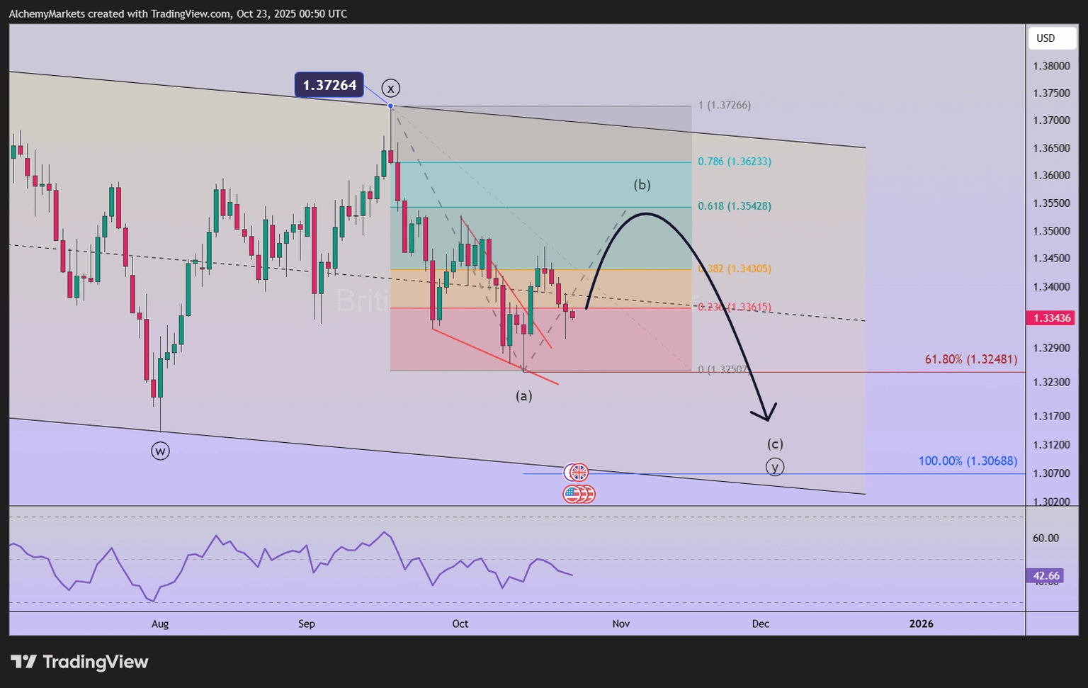 De vuelta al 19 de septiembre, dos días después de un máximo a medio plazo, pronosticamos una caída en el GBP/USD alcanzando 1.31 y posiblemente 1.28. El Cable ha progresado a la baja y el patrón de ondas de Elliott parece estar incompleto hacia abajo.