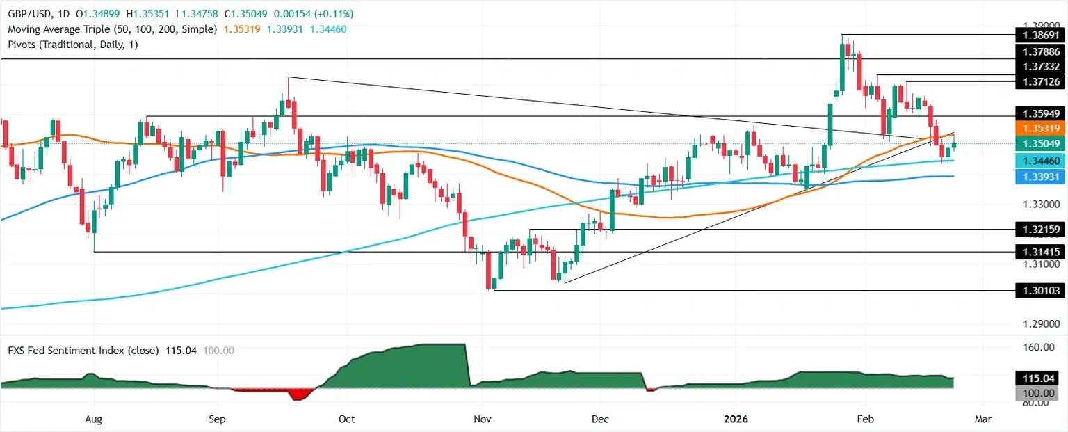 El GBP/USD registra ganancias del 0.31% el lunes después de que la Corte Suprema de EE.UU. rechazara los aranceles del presidente Donald Trump invocados utilizando la Ley de Poderes Económicos de Emergencia Internacional (IEEPA). Mientras tanto, la incertidumbre sobre las políticas comerciales mantiene al Dólar estadounidense (USD) a la expectativa. El par cotiza a 1.3507 después de rebotar desde los mínimos diarios de 1.3475.