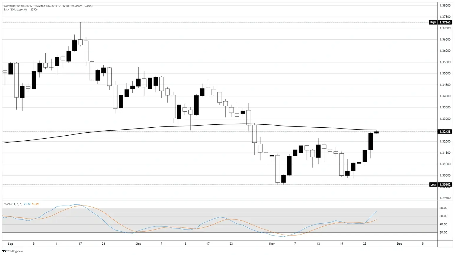El GBP/USD continúa su racha ganadora por sexta sesión consecutiva, cotizando alrededor de 1.3260 durante las horas asiáticas del jueves. El par se aprecia mientras el Dólar estadounidense (USD) lucha en medio del aumento de las probabilidades de recortes de tasas de la Reserva Federal (Fed) en diciembre.