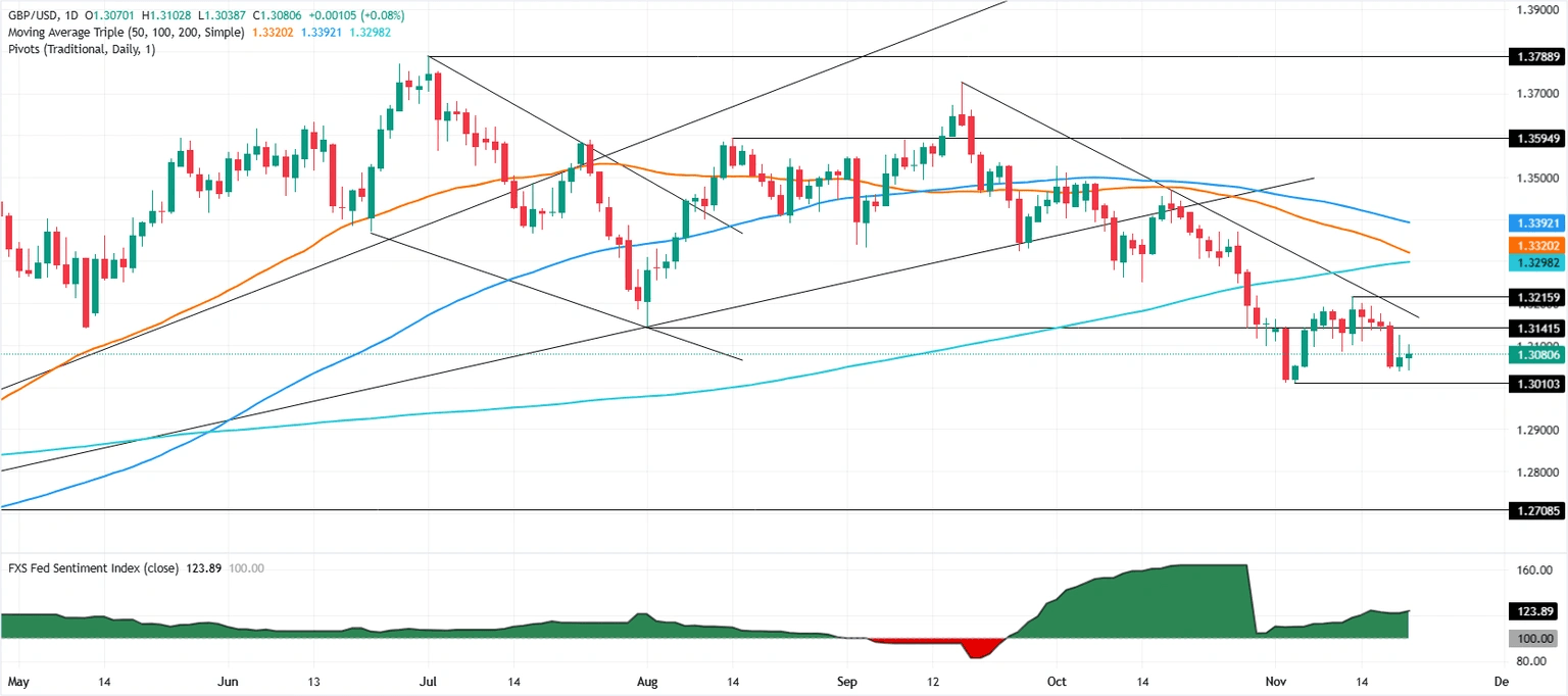 La Libra esterlina se vuelve positiva en el día a medida que los operadores aumentan sus apuestas de que la Reserva Federal podría recortar tasas en la reunión de diciembre. El GBP/USD cotiza en 1.3082, un aumento del 0.08%. Leer más...