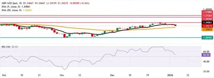 El GBP/USD extiende sus pérdidas por segunda sesión consecutiva, cotizando alrededor de 1.3420 durante las horas asiáticas del lunes. El análisis técnico del gráfico diario indica que el Índice de Fuerza Relativa (RSI) de 14 días en 53 (neutral) ha disminuido desde niveles de sobrecompra, indicando que el impulso se ha enfriado mientras se mantiene por encima de la línea media. El RSI se mantiene por encima de 50, manteniendo un sesgo alcista modesto.