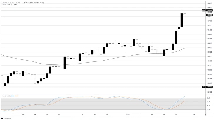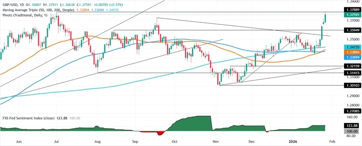 La Libra esterlina (GBP) se dispara durante la sesión norteamericana del martes mientras el Dólar estadounidense (USD) continúa debilitándose debido a la escalada de aranceles comerciales antes de la primera reunión de política monetaria de la Reserva Federal (Fed) de 2026. Al momento de escribir, el GBP/USD cotiza en 1.3776, un aumento del 0.76%, tras alcanzar un máximo de cuatro años de 1.3791.