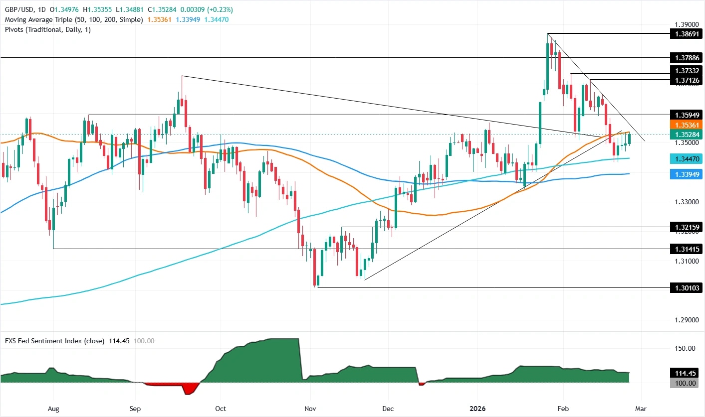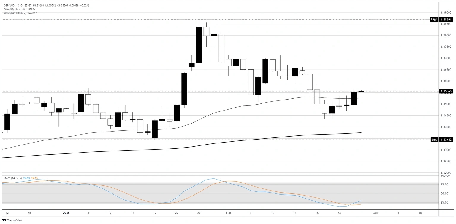 El GBP/USD subió un 0.42% el miércoles, recuperándose hacia 1.3600 en una sesión marcada por datos de inflación del Reino Unido más suaves de lo esperado y una amplia debilidad del Dólar estadounidense. El par había estado consolidándose en un rango estrecho entre aproximadamente 1.3450 y 1.3520 durante los últimos días tras la fuerte caída desde el máximo de finales de enero cerca de 1.3870, y el movimiento del miércoles empujó la acción del precio de nuevo hacia el lado alto de las medias móviles clave.