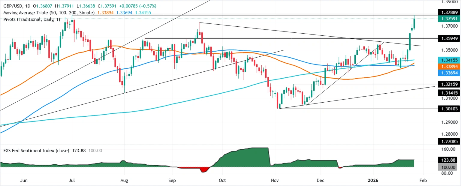 La Libra esterlina se dispara durante la sesión norteamericana del martes mientras el Dólar continúa debilitándose debido a la escalada de aranceles comerciales antes de la primera reunión de política monetaria de la Reserva Federal de 2026. El GBP/USD cotiza en 1.3776, un aumento del 0.76%. Leer más...