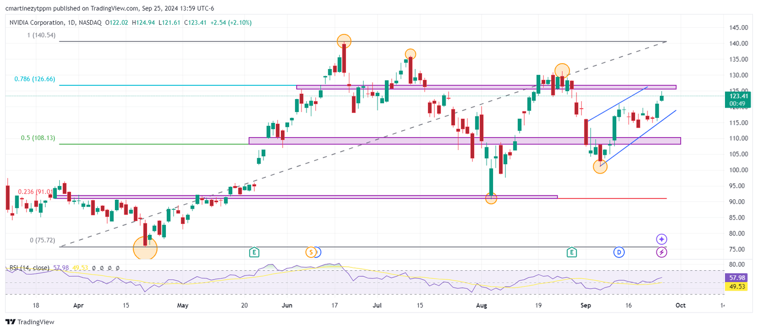 La resistencia más cercana está en 131.26 $, dado por el máximo del 26 de agosto, cercano al 48.6% de Fibonacci.