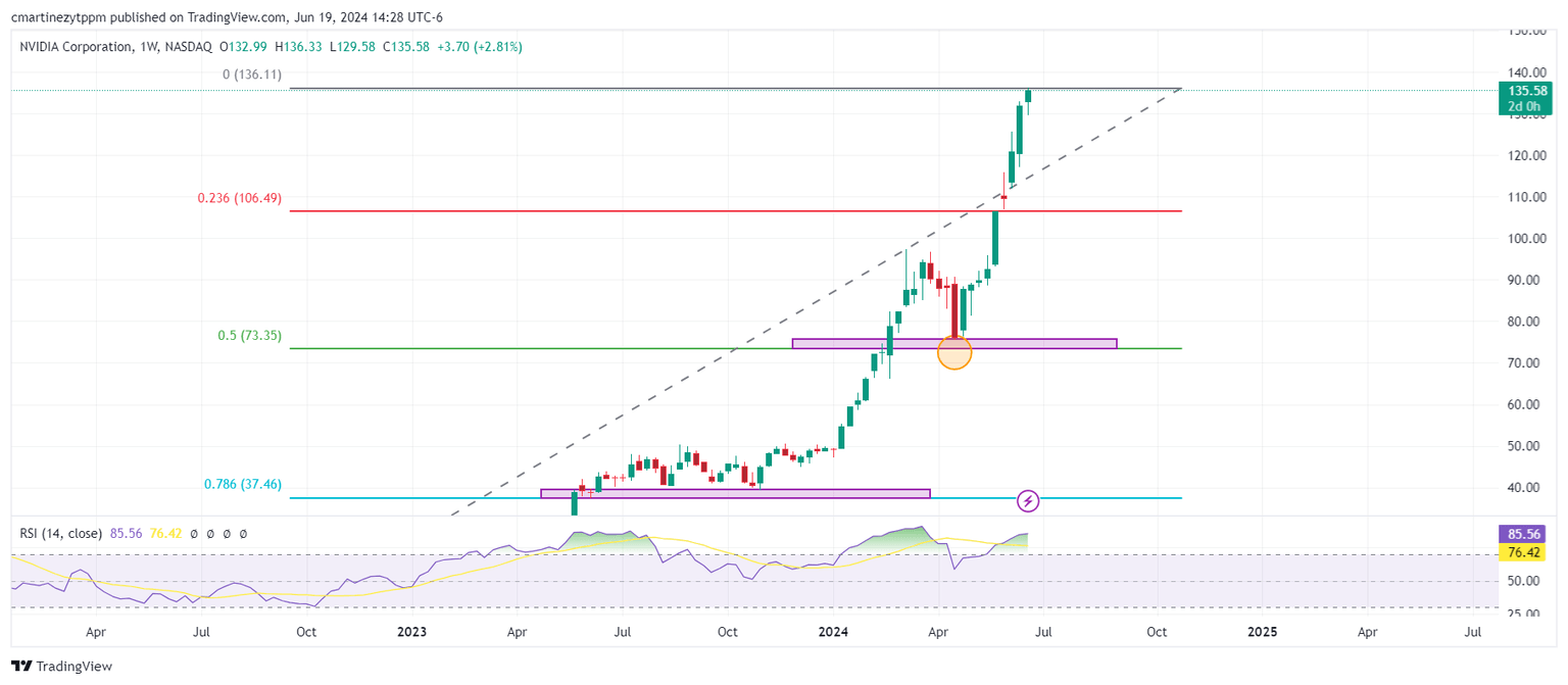 Después de una racha de varias sesiones al alza y de superar las expectativas en sus reportes financieros, NVIDIA se ha posicionado como la empresa con mayor capitalización de mercado en todo el mundo. NVIDIA ha superado a grandes empresas tecnológicas como Microsoft y Apple al subir un 3.5% el día de ayer, registrando un máximo histórico en 136.33 $ y cerrando la sesión en 135.64 $.