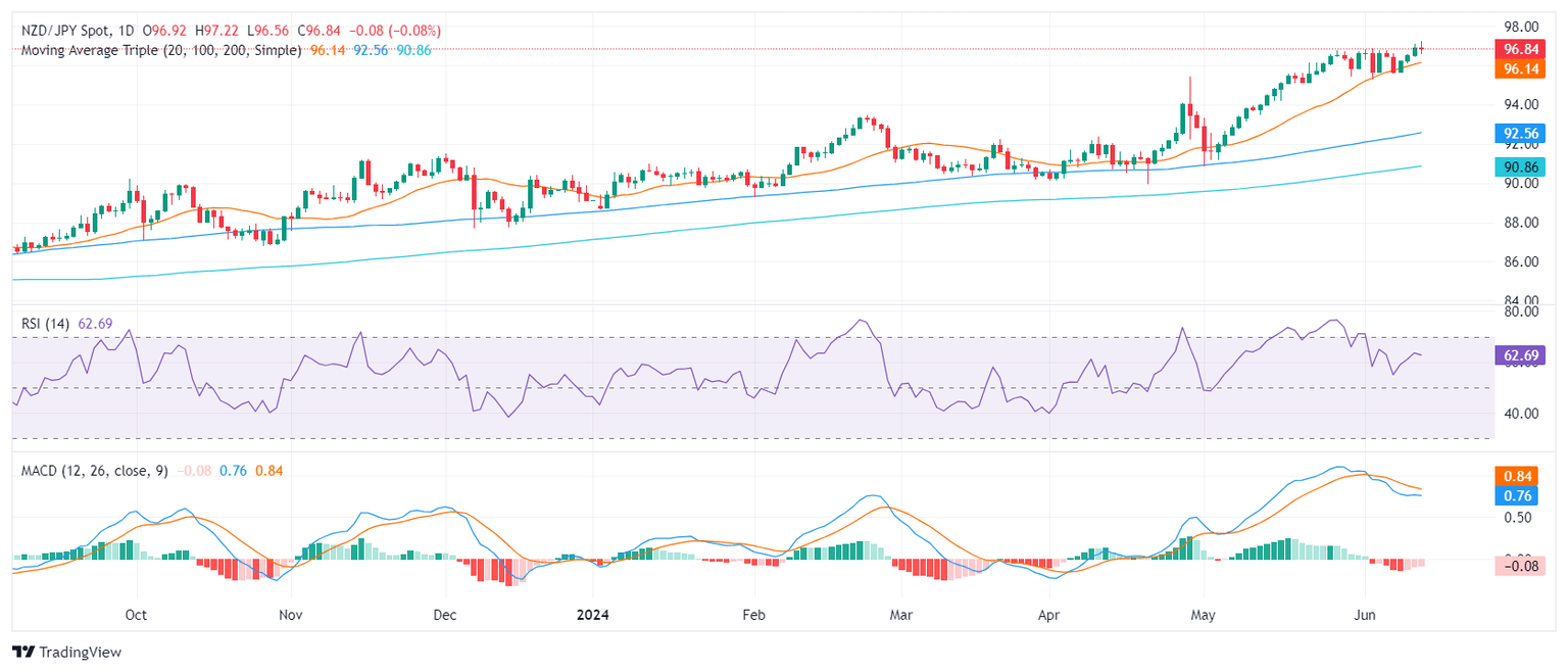 El RSI diario para el NZD/JPY ha retrocedido ligeramente a 59, lo que indica una disminución del impulso alcista. El indicador de MACD continúa presentando barras rojas planas, lo que respalda aún más la perspectiva de una consolidación en curso.