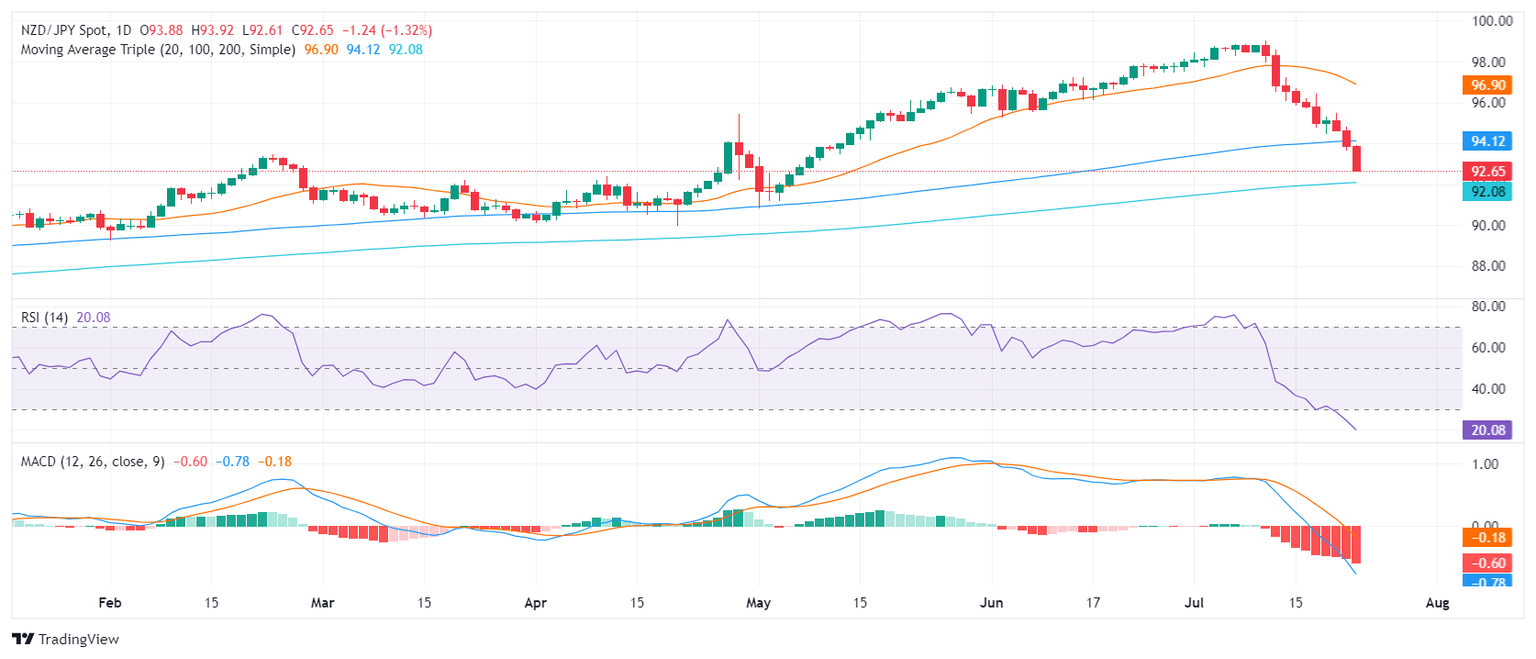 En la sesión de trading del martes, el par NZD/JPY continuó su caída y bajó a 92.60, marcando una caída del 1.30%. El par ha visto pérdidas en nueve de las últimas diez sesiones, aumentando significativamente el impulso bajista. Desde principios de julio, el cruce ha caído un masivo 5%, ahora habiendo cavado sus garras por debajo de la crucial media móvil simple (SMA) de 100 días.