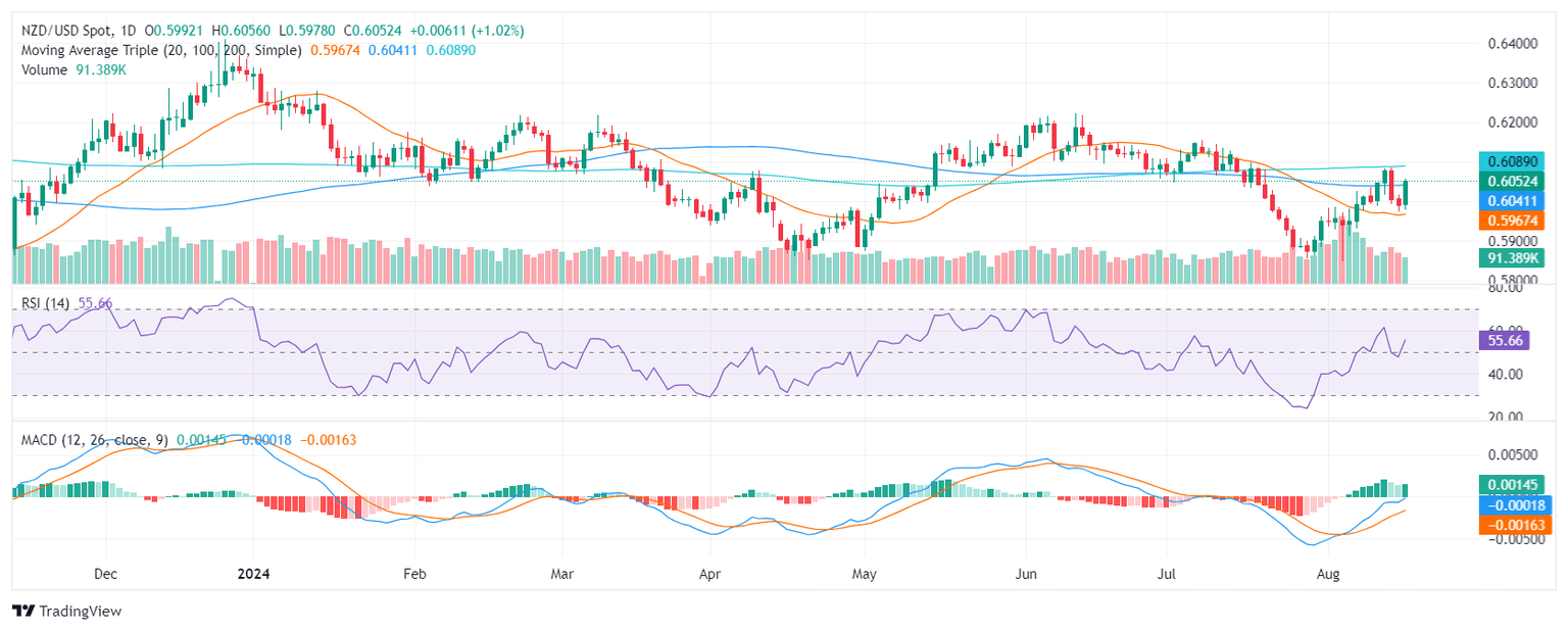En el gráfico diario, el par NZD/USD enfrenta una resistencia inmediata en 0.6060. Una ruptura por encima de este nivel podría abrir la puerta a un mayor repunte hacia 0.6080 y 0.6100 (SMA de 200 días). A la baja, el soporte inmediato se encuentra en 0.6030. Una ruptura por debajo de este nivel podría llevar a una corrección más profunda hacia 0.5990 (SMA de 20 días) y 0.5970. Los traders deben monitorear cualquier ruptura por encima o por debajo de los niveles mencionados, ya que podrían desencadenar movimientos bruscos.