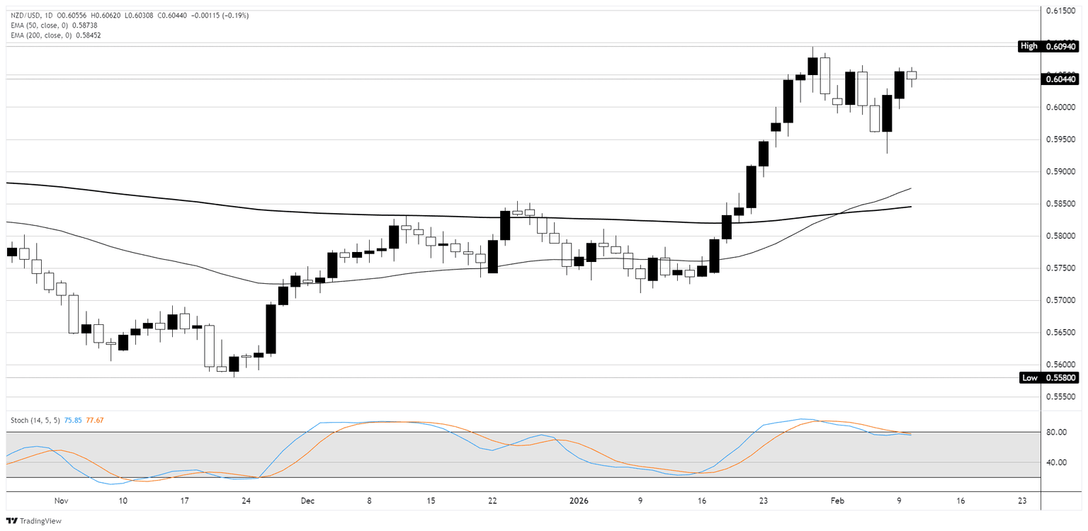 El Dólar Neozelandés se está negociando en una tendencia alcista bien definida en el gráfico diario, con el precio manteniéndose por encima de la Media Móvil Exponencial (EMA) de 50 en 0.5874 y la EMA de 200 en 0.5845 tras un fuerte repunte desde el mínimo de finales de noviembre cerca de 0.5580. El NZD/USD alcanzó un máximo de 0.6094 a finales de enero antes de entrar en una fase de consolidación entre aproximadamente 0.6000 y 0.6094 durante las últimas dos semanas, con la sesión del lunes cerrando en 0.6043, bajando un 0.21% en el día.