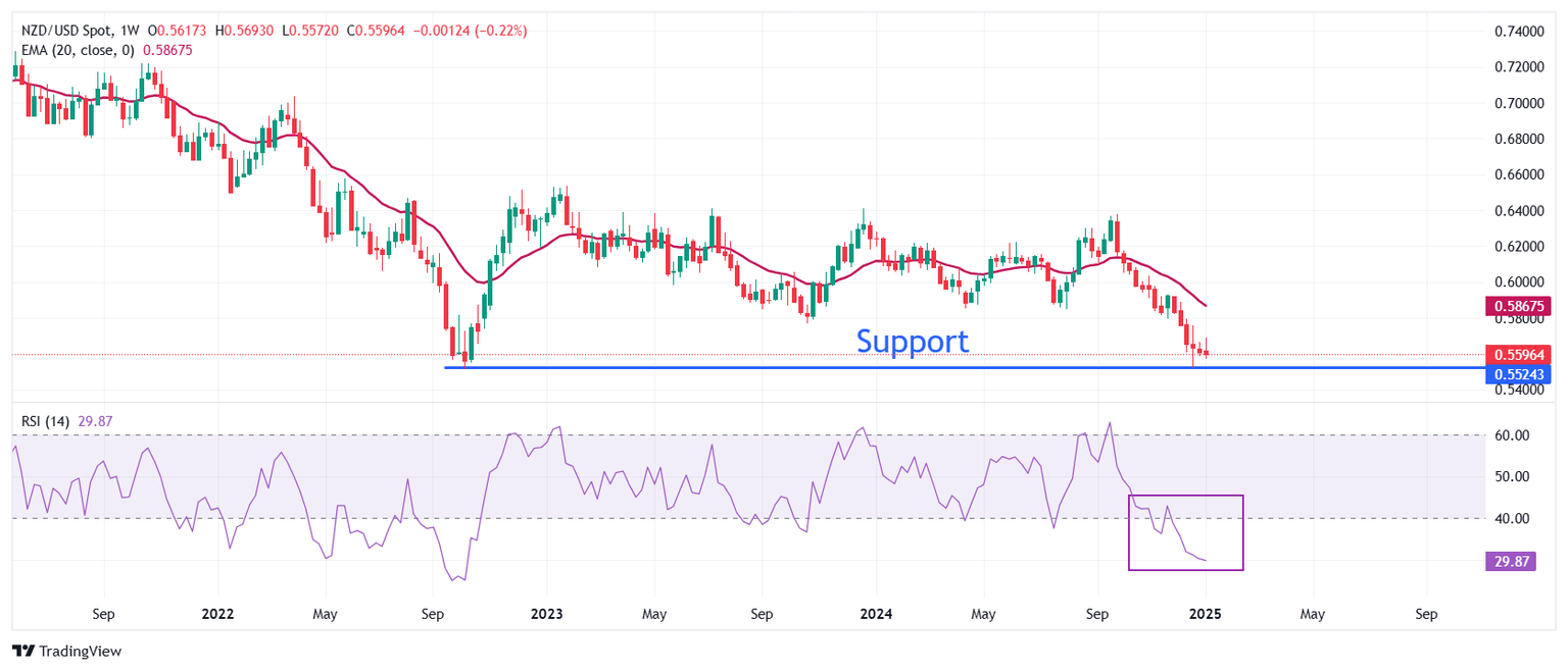 El NZD/USD encuentra un soporte temporal cerca del mínimo de dos años de 0.5520 en un marco de tiempo semanal. Sin embargo, la perspectiva del par NZD sigue siendo bajista, ya que la media móvil exponencial (EMA) de 20 semanas, que se negocia alrededor de 0.5867, está en declive.