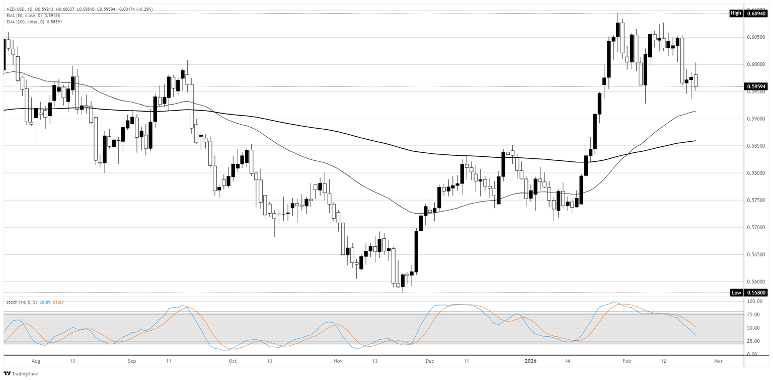 En el gráfico diario, el NZD/USD cayó un 0.34% el lunes, probando brevemente por debajo de 0.5960 antes de rebotar hacia 0.6000 después de que un intento alcista anterior en la sesión se desvaneciera. El par se mantiene por encima de la media móvil exponencial (EMA) de 50 días en 0.5915 y la EMA de 200 días en 0.5860, manteniendo válida la tendencia alcista más amplia desde el mínimo de oscilación de finales de noviembre cerca de 0.5600. El oscilador estocástico ha cruzado a la baja y está cayendo a través del punto medio, sugiriendo que el impulso se está debilitando tras el retroceso desde el máximo del año hasta la fecha en 0.6094. Un grupo de velas de amplio rango con dirección alternante en las sesiones recientes apunta a una acción de precios errática y bidireccional en lugar de una tendencia clara. El soporte inmediato se sitúa en el mínimo de sesión de 0.5956 y el nivel psicológico de 0.5900, mientras que la resistencia está en 0.6000 y luego en el máximo de 0.6094; una ruptura por encima apuntaría a 0.6200, pero una pérdida de 0.5900 podría exponer la EMA de 50 días.