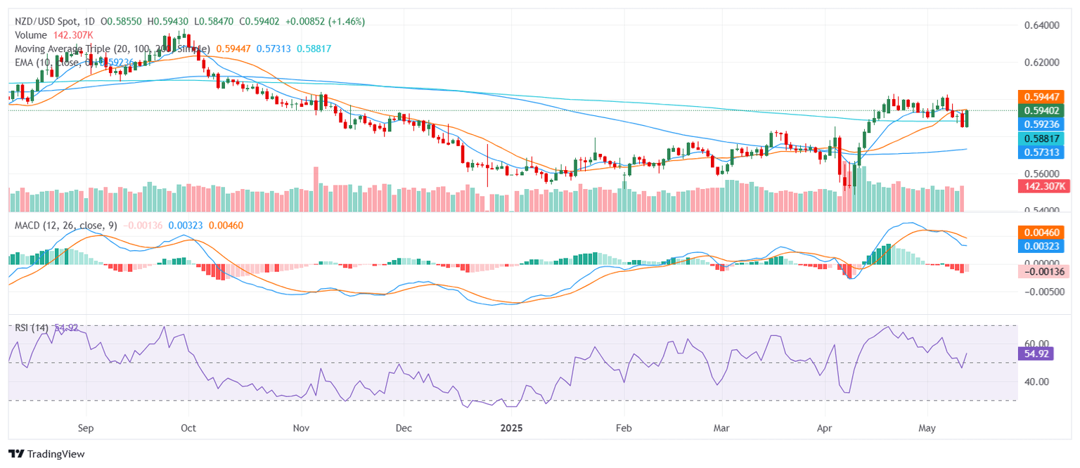 El NZD/USD está mostrando señales alcistas, negociándose alrededor de 0.5900, con un aumento de aproximadamente 1.5% en el día. El par se sitúa cerca de la parte superior de su rango diario (0.5847 – 0.5942). El Índice de Fuerza Relativa (RSI) se mantiene en los 50, indicando condiciones neutrales, mientras que el indicador de Convergencia/Divergencia de Medias Móviles (MACD) señala un impulso de venta. El Momentum (10) está alrededor de 0, sugiriendo condiciones de compra, al igual que la Media Móvil Exponencial (EMA) de 10 días y la Media Móvil Simple (SMA), ambas alrededor de 1. El Índice de Canal de Productos (20) y el Oscilador Asombroso están ambos alrededor de 0, señalando condiciones neutrales.