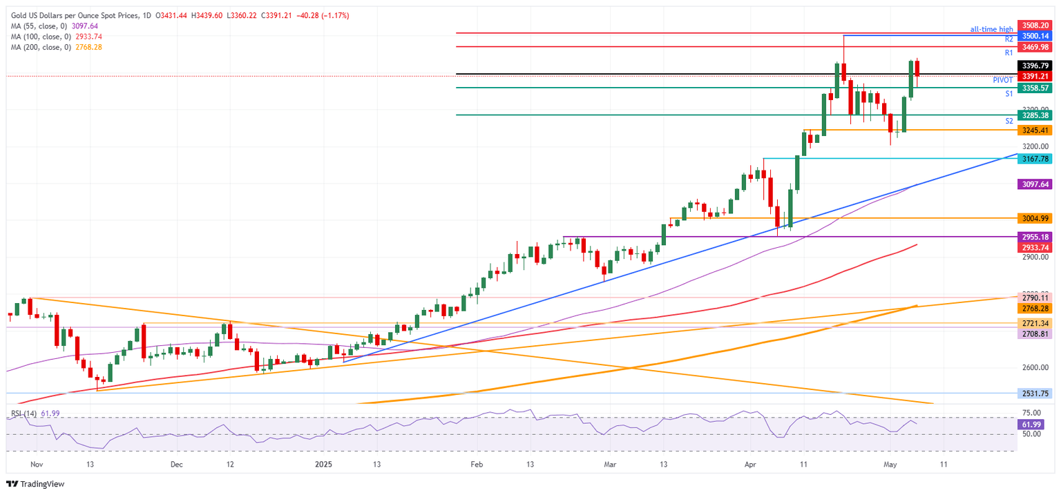 La corrección del precio del Oro del miércoles parece justificada dado que se ha dado un primer paso con China y EE.UU. llegando a la mesa de negociaciones. Sin embargo, eso no significa que este sea el fin de la tendencia alcista para el Oro y que el metal precioso caerá por debajo de 3.000$ pronto. Las conversaciones están en una primera fase y parecen ser solo desescalatorias, abriendo riesgos adicionales de titulares que indiquen que estas conversaciones no están yendo bien o incluso podrían fracasar.