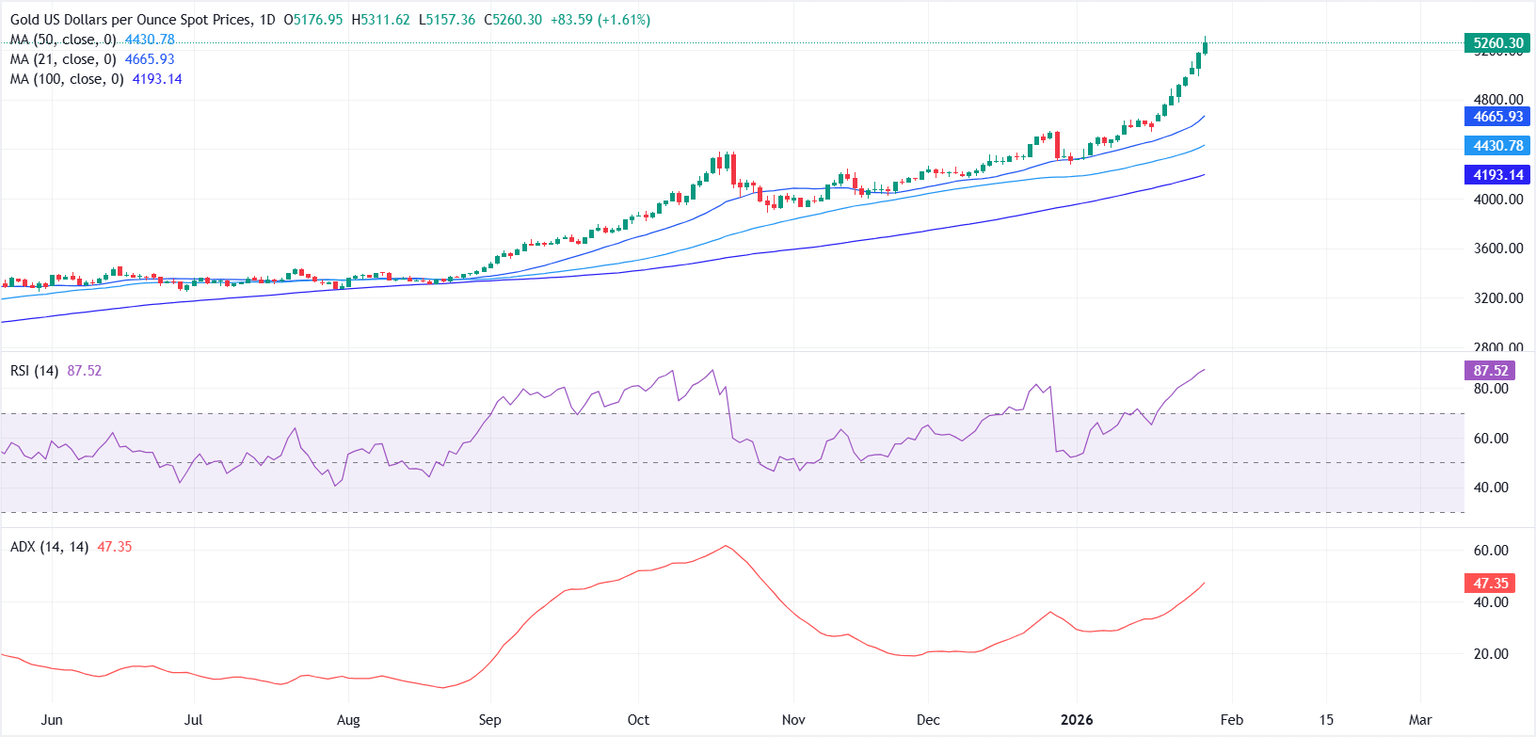 Desde una perspectiva técnica, el XAU/USD sigue siendo firmemente alcista en el gráfico diario, con velas verdes consecutivas y la acción del precio manteniéndose bien por encima de las medias móviles simples (SMA) de 21 días, 50 días y 100 días, destacando una fuerte presión alcista.