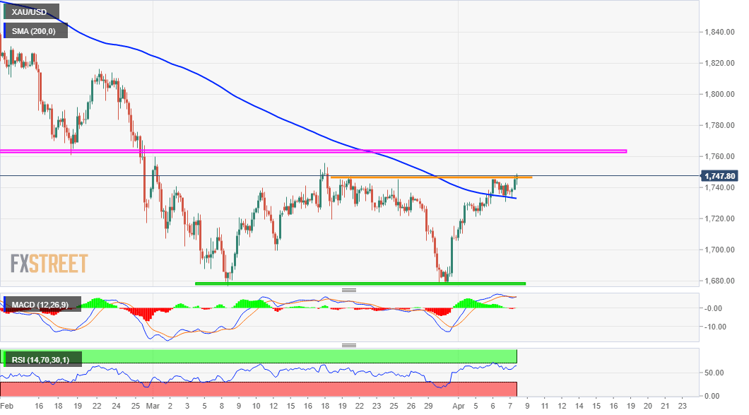 Desde una perspectiva técnica, la aceptación por encima de la media móvil simple (SMA) de 200 períodos en el gráfico de 4 horas respalda las perspectivas de una extensión del reciente rebote desde mínimos de varios meses, alrededor de la región de 1.677-76$, que constituyó la formación de un doble suelo alcista. La perspectiva constructiva se ve reforzada por el hecho de que los osciladores en los gráficos horarios han estado ganando tracción positiva y simplemente se han movido al territorio alcista en el gráfico diario.