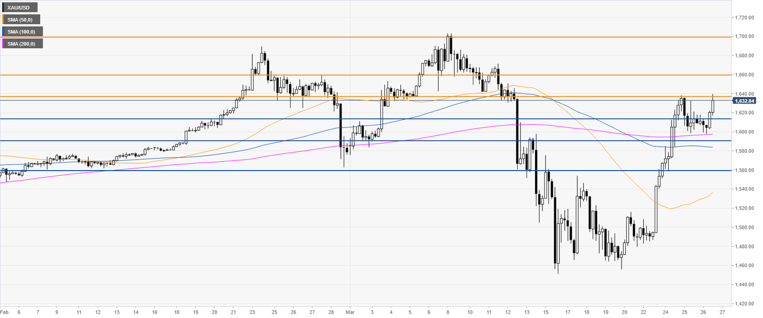 El metal está desafiando la resistencia de 1636, ya que el XAU/USD cotiza por encima de las principales SMA en el gráfico de cuatro horas. A medida que los alcistas tienen el control, una ruptura del nivel mencionado anteriormente puede conducir a mayores ganancias hacia los niveles de precios de 1660 y 1700, mientras que se puede esperar un soporte cercano a los niveles de 1614, 1590 y 1560 a la baja.