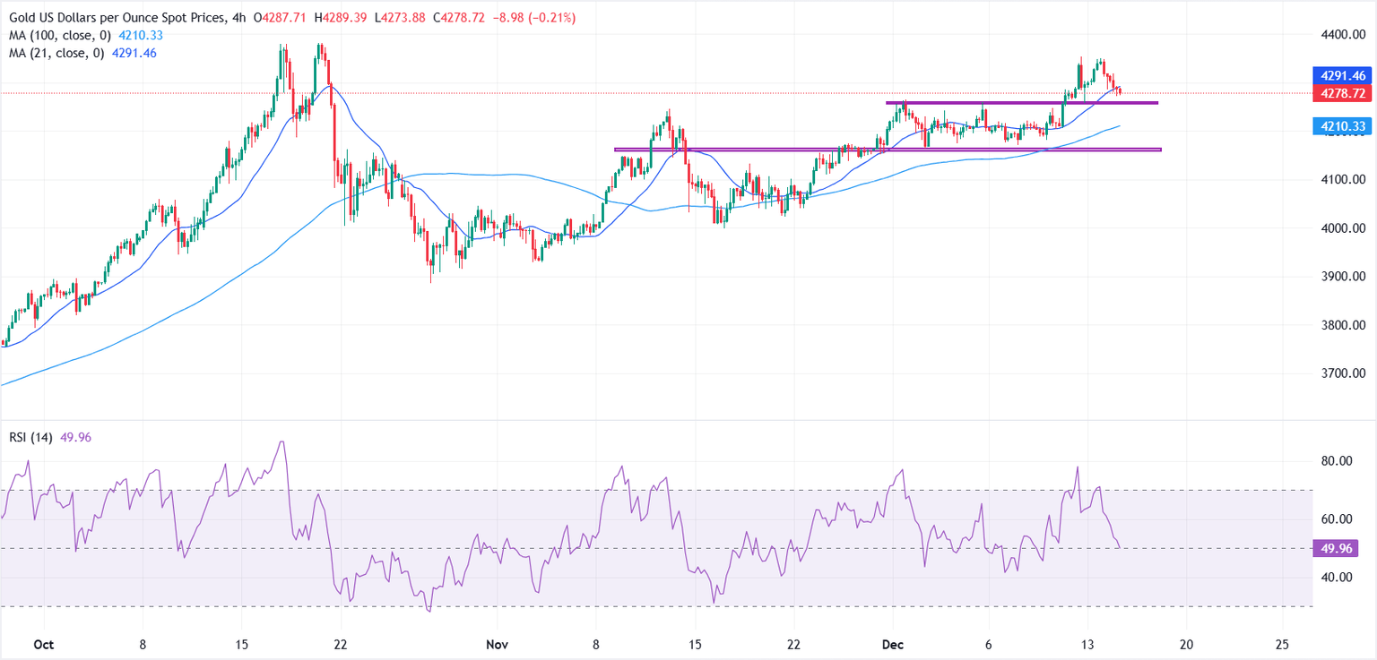 Análisis técnico: XAU/USD apunta al soporte de 4.250$ tras fallar cerca de 4.350$