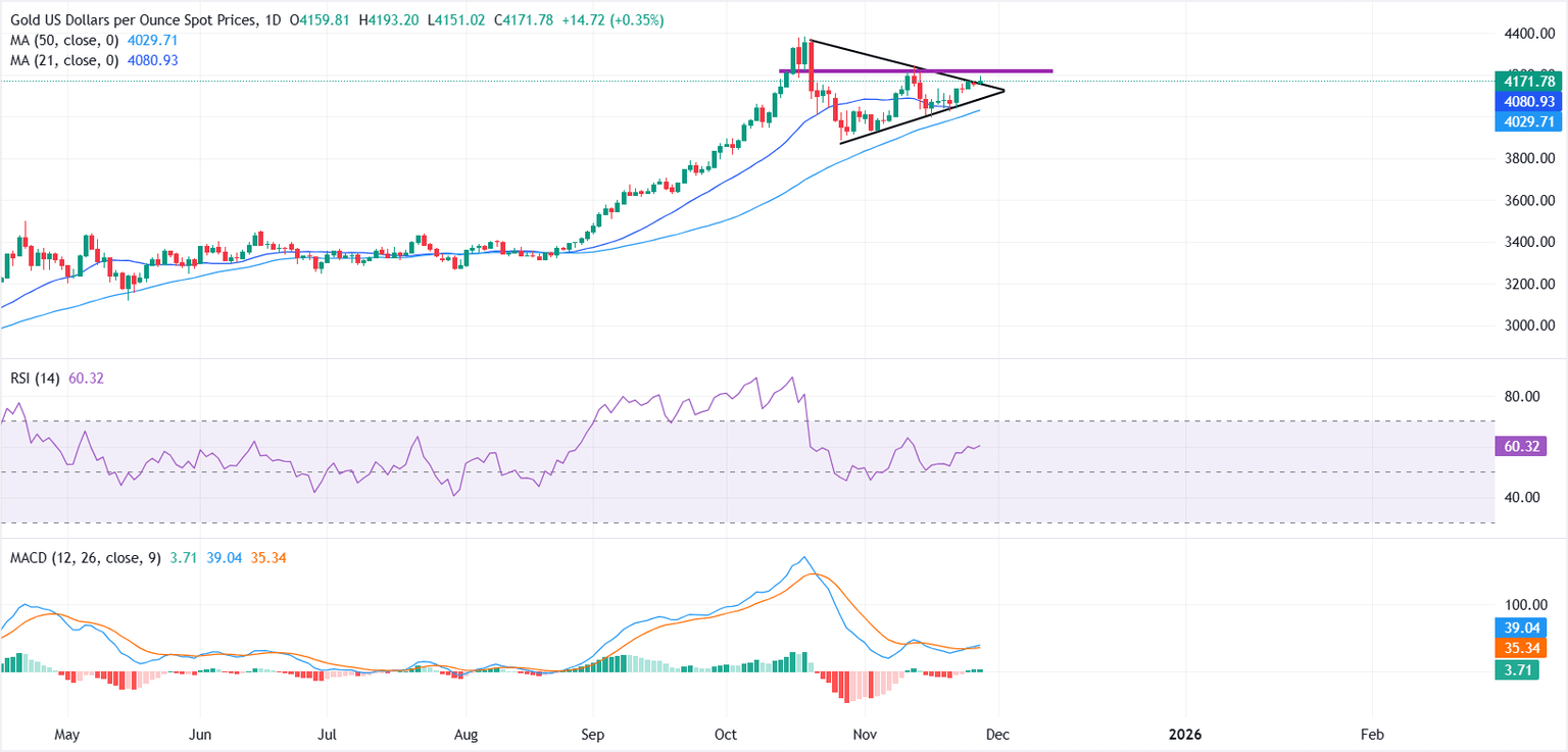 El XAU/USD está intentando una ruptura de un patrón de triángulo simétrico en el gráfico diario, con precios manteniéndose justo por encima del límite superior de la formación. Sin embargo, el nivel psicológico de 4.200$ sigue limitando los intentos inmediatos al alza, y se necesita un cierre diario decisivo por encima de esta barrera para confirmar la continuación alcista.