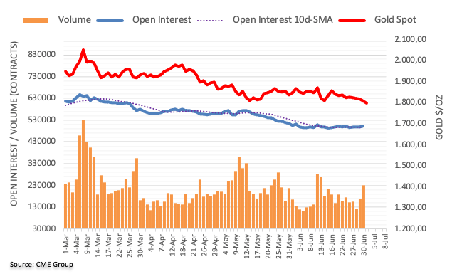 Los precios del oro ampliaron la corrección a la baja una sesión más el jueves y amenazan con romper por debajo de la zona de contención clave en torno a los 1.800 dólares. El movimiento se produjo por el aumento del interés abierto, que apoya las pérdidas adicionales en el corto plazo y con el objetivo potencial en el mínimo de 2022 en 1.780 dólares por onza troy.
