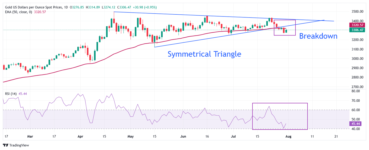 El precio del Oro rebota cerca de 3.320$ para volver a probar la ruptura de la formación de Triángulo Simétrico en un marco de tiempo diario. La Media Móvil Exponencial (EMA) de 50 días actúa como una barrera clave para el precio del oro alrededor de 3.320$.
