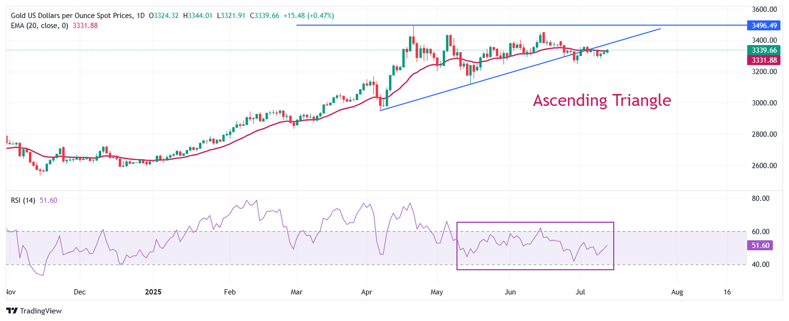 El precio del Oro se recupera cerca de la media móvil exponencial (EMA) de 20 días, que se negocia alrededor de 3.330$. El metal precioso se mantiene por debajo de la formación de triángulo ascendente en un marco temporal diario.