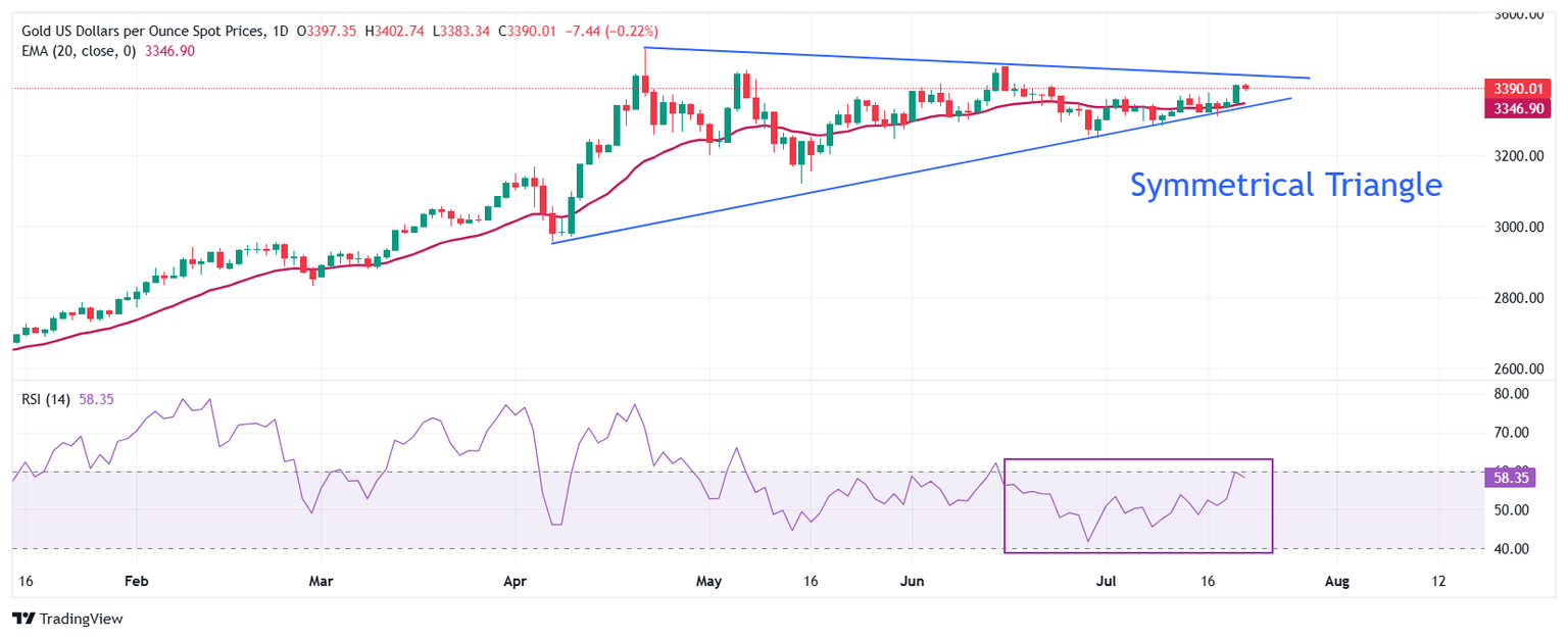 El precio del Oro cotiza en una formación de Triángulo Simétrico en un marco de tiempo diario, lo que indica una contracción de la volatilidad. La línea de tendencia ascendente del patrón de gráfico mencionado anteriormente se coloca desde el mínimo del 15 de mayo de 3.120,83$, mientras que su borde descendente se traza desde el máximo del 22 de abril alrededor de 3.500$.