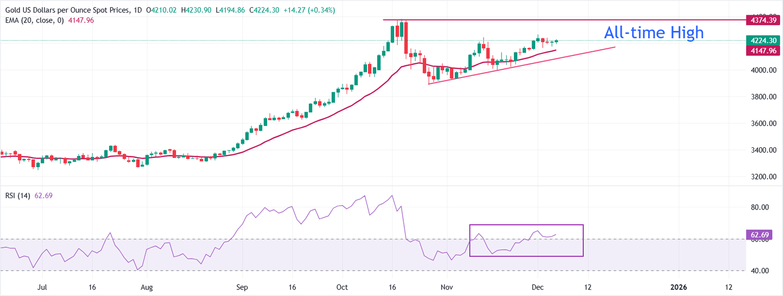 En el gráfico diario, el XAU/USD se negocia alrededor de 4.190$ durante las horas de negociación europeas del viernes. La media móvil exponencial (EMA) de 20 días en 4.147,96$ sube, con el precio manteniéndose por encima de ella para mantener un sesgo positivo. Los retrocesos hacia la EMA de 20 días encontrarían soporte mientras su pendiente se mantenga en alza.