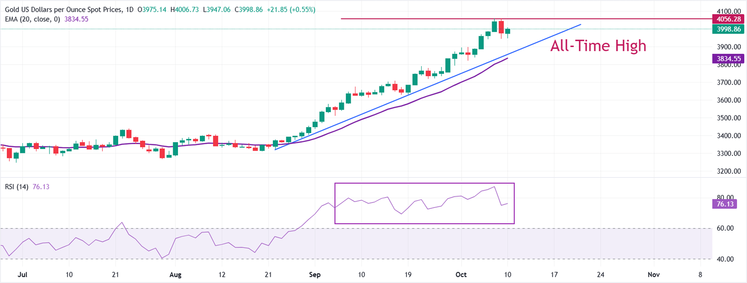 El precio del Oro retrocede tras registrar un nuevo máximo histórico cerca de 4.060$. Sin embargo, la tendencia general del precio del Oro sigue siendo alcista, ya que la media móvil exponencial (EMA) de 20 días se inclina al alza alrededor de 3.834,10$. La línea de tendencia ascendente desde el mínimo del 22 de agosto alrededor de 3.321,50$ actuará como soporte clave para el precio del Oro.