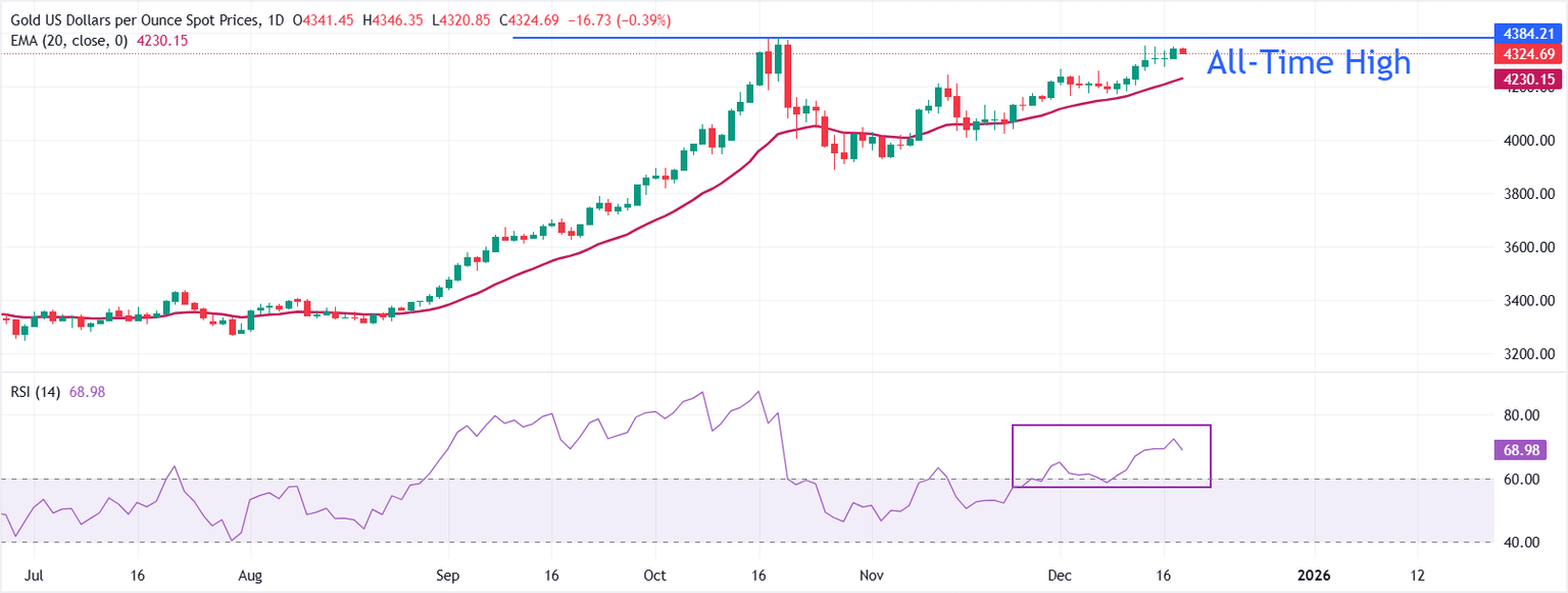 El precio del Oro cotiza a la baja a cerca de 4.324,56$ el jueves. El precio se mantiene firmemente por encima de la media móvil exponencial (EMA) de 20 días en 4.230,13$, ya que la media continúa avanzando de manera constante, confirmando un sesgo alcista. La ampliación de la diferencia entre el precio al contado y la EMA subraya la fortaleza de la tendencia.